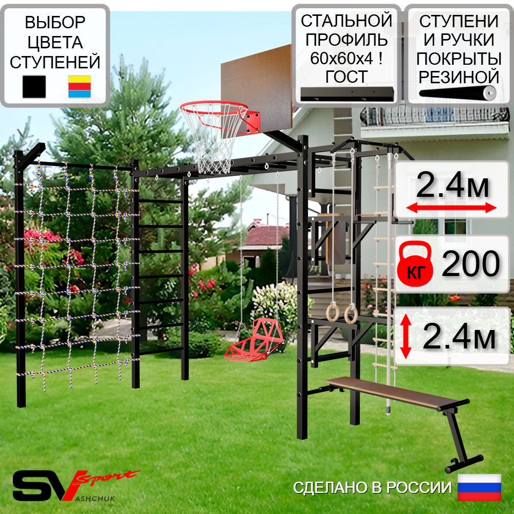 КОМПЛЕКТАЦИЯ: Каркас УШС Sv Sport Рукоход, Турник Sv Sport стандарт к УШС, Брусья Sv Sport к УШС, Стойка под штангу Sv Sport к УШС, Скамья для пресса и жима Sv Sport к УШС, Качели пластиковые со спинкой на цепях, Щит баскетбольный Sv Sport c кронштейном к УШС Sv Sport, Кронштейн для подвеса боксерского мешка, Комплект: канат с крепежом, кольца гимнастические деревянные, лестница веревочная, Сетка к спортивному комплексу, Комплект турник прямой.
