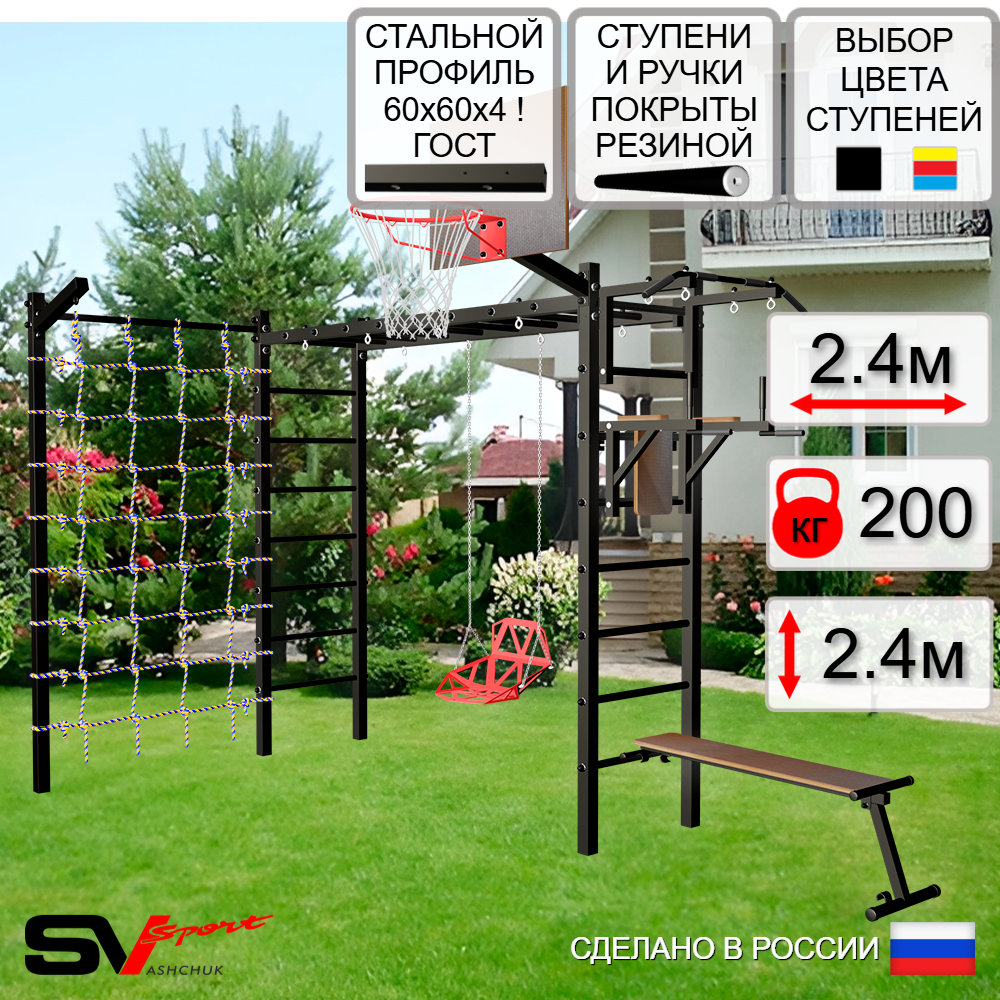 КОМПЛЕКТАЦИЯ: Каркас УШС Sv Sport Рукоход, Турник Sv Sport стандарт к УШС, Брусья Sv Sport к УШС, Скамья для пресса и жима Sv Sport к УШС, Качели пластиковые со спинкой на цепях, Щит баскетбольный Sv Sport c кронштейном к УШС Sv Sport, Кронштейн для подвеса боксерского мешка, Сетка к спортивному комплексу, Комплект турник прямой.