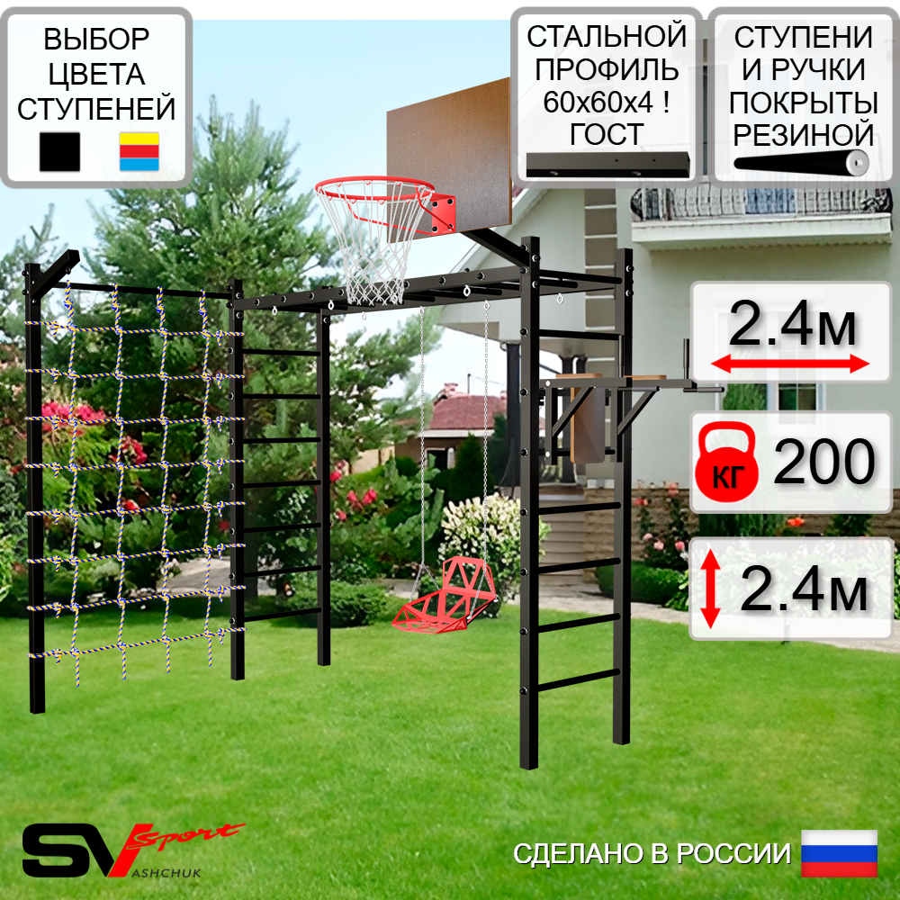 КОМПЛЕКТАЦИЯ: Каркас УШС Sv Sport Рукоход, Брусья Sv Sport к УШС, Качели пластиковые со спинкой на цепях, Щит баскетбольный Sv Sport c кронштейном к УШС Sv Sport, Кронштейн для подвеса боксерского мешка, Сетка к спортивному комплексу, Комплект турник прямой.