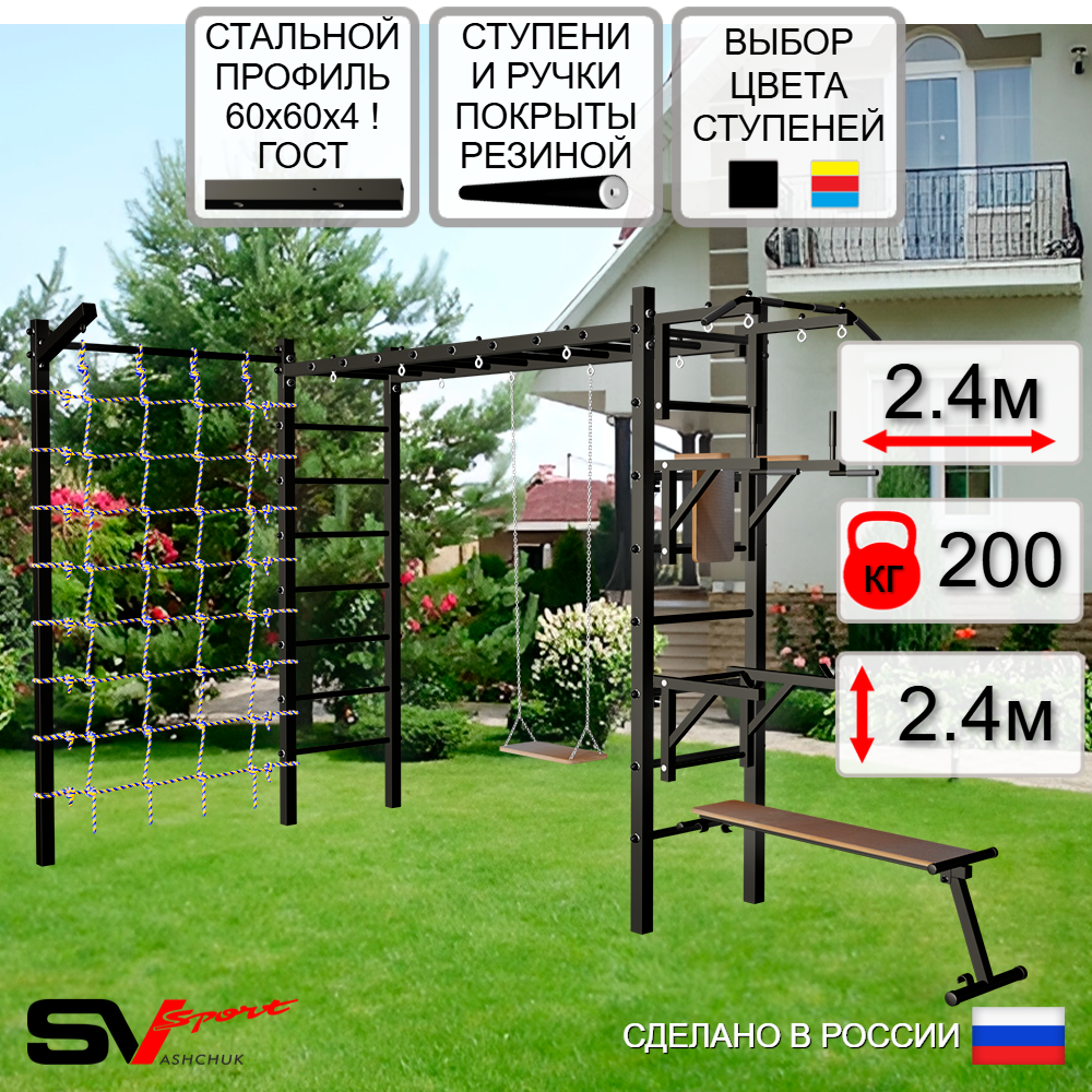 КОМПЛЕКТАЦИЯ: Каркас УШС Sv Sport Рукоход, Турник Sv Sport стандарт к УШС, Брусья Sv Sport к УШС, Стойка под штангу Sv Sport к УШС, Скамья для пресса и жима Sv Sport к УШС, Качели деревянные на цепях Sv Sport, Кронштейн для подвеса боксерского мешка, Сетка к спортивному комплексу, Комплект турник прямой.
