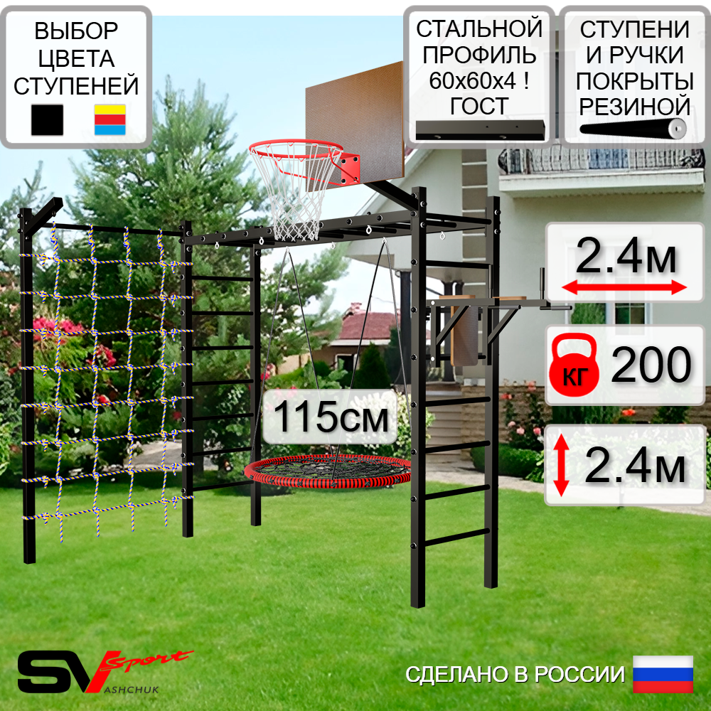 КОМПЛЕКТАЦИЯ: Каркас УШС Sv Sport Рукоход, Брусья Sv Sport к УШС, Качели - гнездо 115см, Щит баскетбольный Sv Sport c кронштейном к УШС Sv Sport, Кронштейн для подвеса боксерского мешка, Сетка к спортивному комплексу, Комплект турник прямой.
