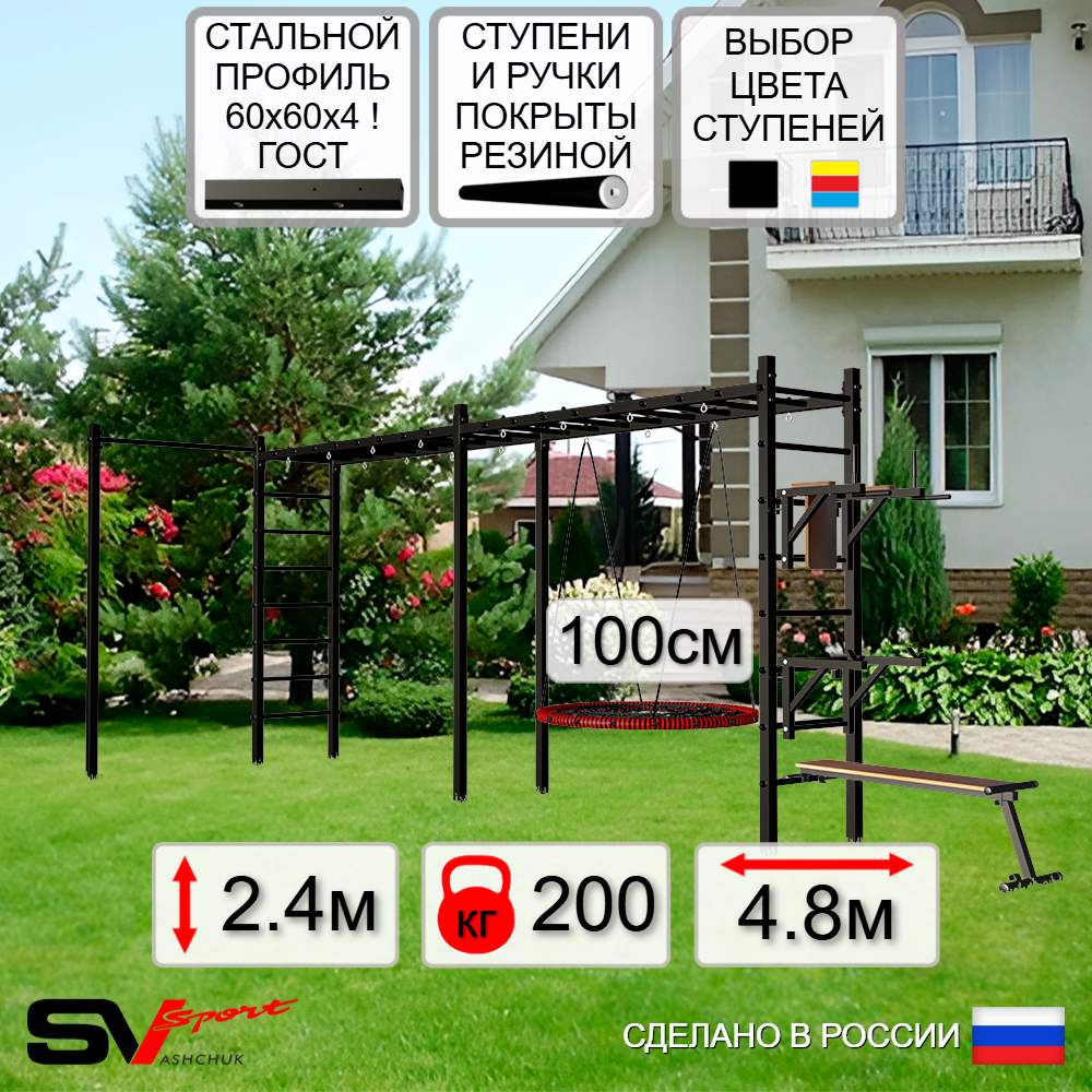 КОМПЛЕКТАЦИЯ: Каркас УШС Sv Sport Рукоход х 2, Брусья Sv Sport к УШС, Стойка под штангу Sv Sport к УШС, Скамья для пресса и жима Sv Sport к УШС, Качели - гнездо 100см, Комплект турник прямой.