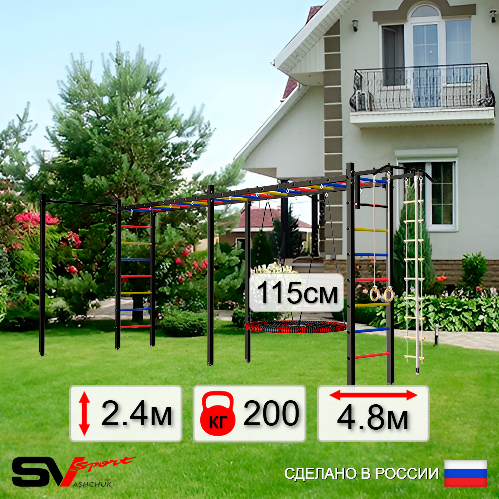 КОМПЛЕКТАЦИЯ: Каркас УШС Sv Sport Рукоход х 2, Турник Sv Sport стандарт к УШС, Качели - гнездо 115см, Комплект: канат с крепежом, кольца гимнастические деревянные, лестница веревочная, Комплект турник прямой.