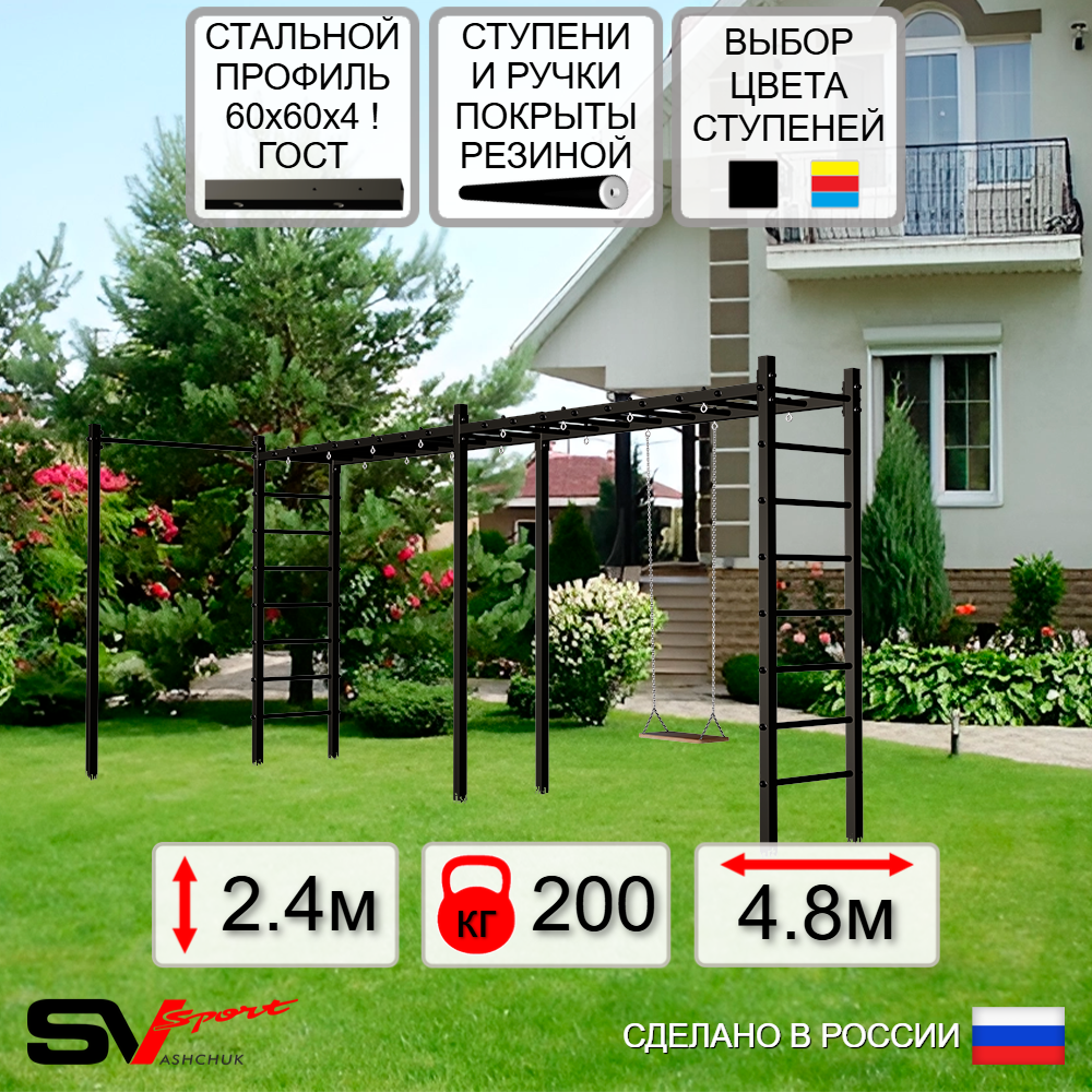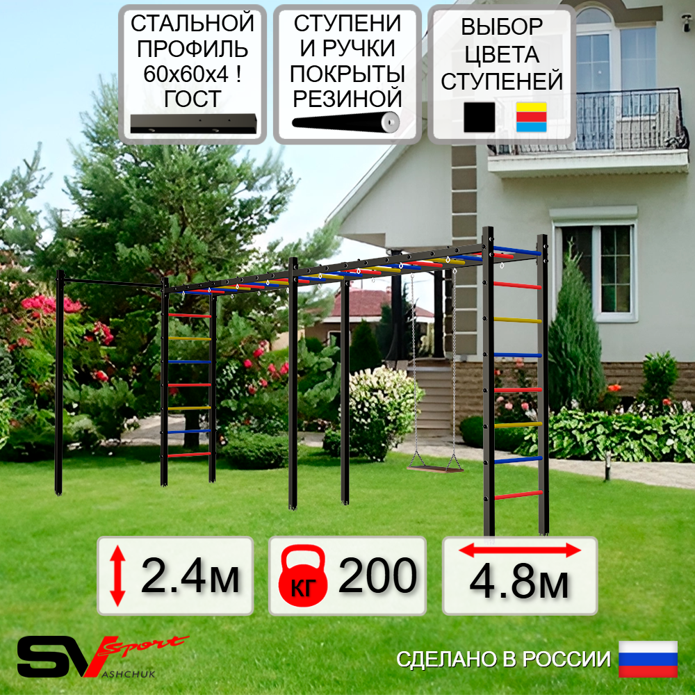 Уличная шведская стенка Sv Sport рукоход станет отличным подарком для активных взрослых, детей и подростков. Благодаря возможности установки навесного оборудования: турник, брусья, скамья, сетка, качели, она превращается в уникальный игровой центр, где можно весело проводить время с друзьями. Модель выполнена из высококачественных материалов: вертикальные столбы изготовлены из стальной профильной трубы 60 х 60 х 4 мм ГОСТ, горизонтальные из стальной профильной трубы 60 х 60 х 3 мм ГОСТ. Ступени изготовлены из круглой, стальной трубы, покрытой резиной (не скользят, не натирают мозоли, не прокручиваются, не имеют запаха, приятны на ощупь). Окрашена качественной, импортной порошковой краской в 2 этапа, устойчивой к коррозии, истиранию и температурным перепадам. Все торцы, болты, гайки заглушены пластиковыми заглушками. Устанавливается путем бетонировки на глубину не менее 600 мм.