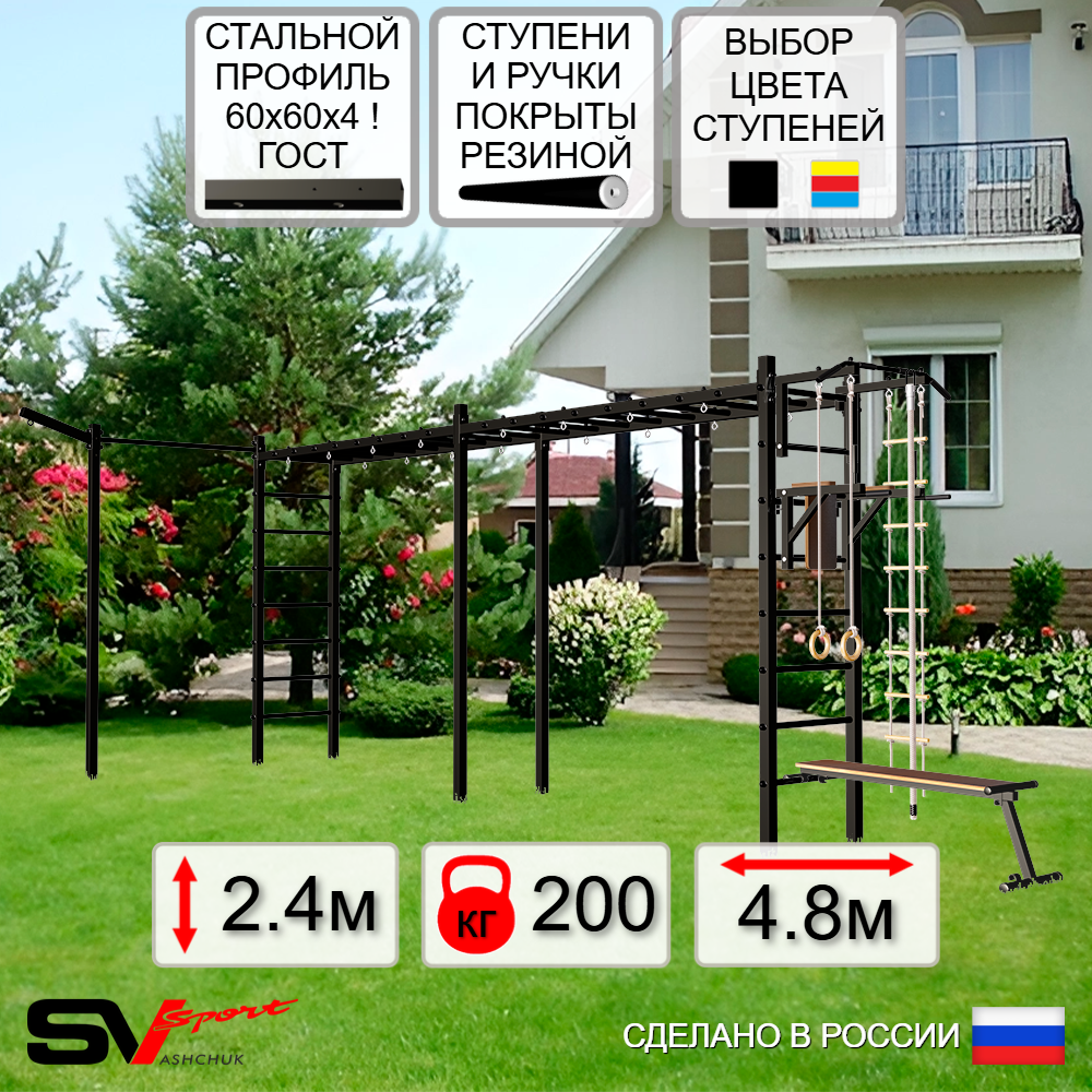 КОМПЛЕКТАЦИЯ: Каркас УШС Sv Sport Рукоход х 2, Турник Sv Sport стандарт к УШС, Брусья Sv Sport к УШС, Скамья для пресса и жима Sv Sport к УШС, Кронштейн для подвеса боксерского мешка, Комплект: канат с крепежом, кольца гимнастические деревянные, лестница веревочная, Комплект турник прямой.