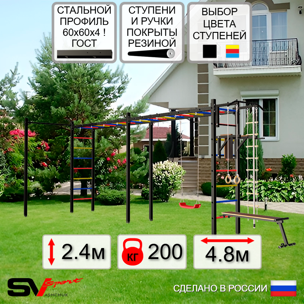 КОМПЛЕКТАЦИЯ: Каркас УШС Sv Sport Рукоход х 2, Турник Sv Sport стандарт к УШС, Брусья Sv Sport к УШС, Скамья для пресса и жима Sv Sport к УШС, Качели пластиковые "Лодочка", Комплект: канат с крепежом, кольца гимнастические деревянные, лестница веревочная, Комплект турник прямой.