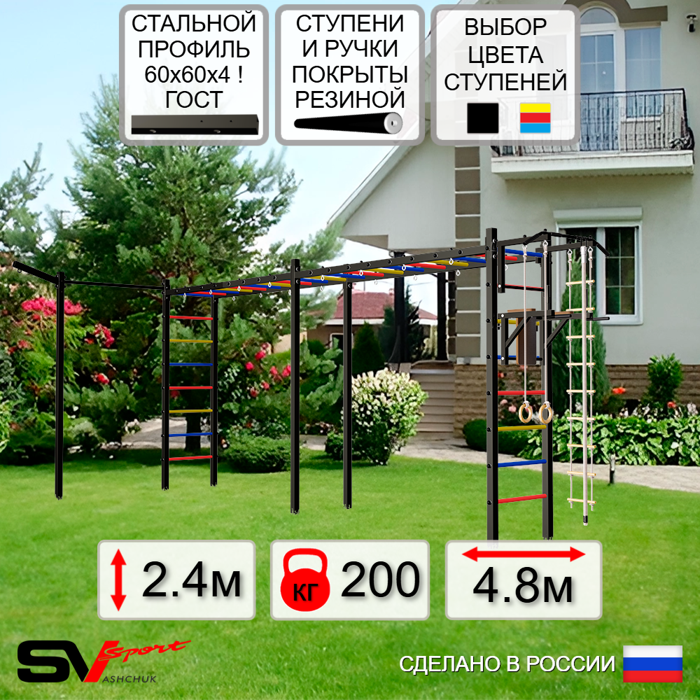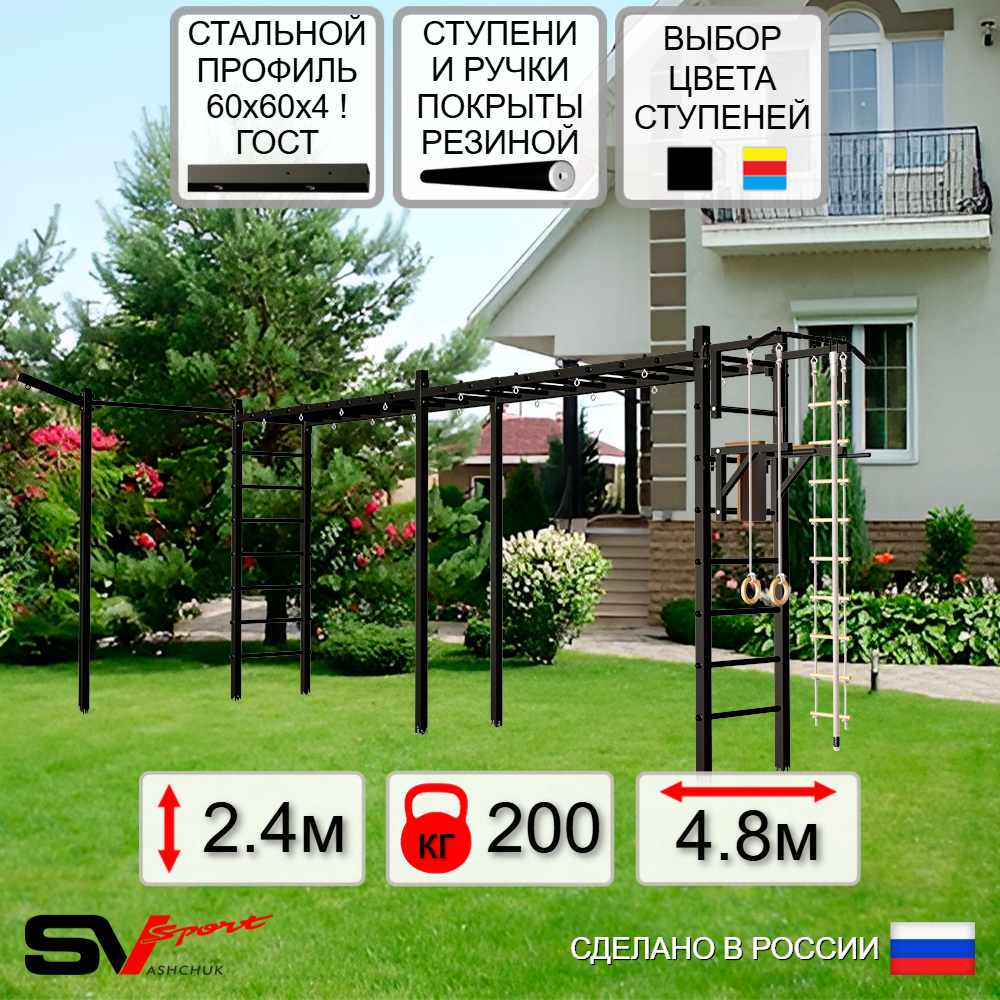 Уличная шведская стенка Sv Sport рукоход станет отличным подарком для активных взрослых, детей и подростков. Благодаря возможности установки навесного оборудования: турник, брусья, скамья, сетка, качели, она превращается в уникальный игровой центр, где можно весело проводить время с друзьями. Модель выполнена из высококачественных материалов: вертикальные столбы изготовлены из стальной профильной трубы 60 х 60 х 4 мм ГОСТ, горизонтальные из стальной профильной трубы 60 х 60 х 3 мм ГОСТ. Ступени изготовлены из круглой, стальной трубы, покрытой резиной (не скользят, не натирают мозоли, не прокручиваются, не имеют запаха, приятны на ощупь). Окрашена качественной, импортной порошковой краской в 2 этапа, устойчивой к коррозии, истиранию и температурным перепадам. Все торцы, болты, гайки заглушены пластиковыми заглушками. Устанавливается путем бетонировки на глубину не менее 600 мм.