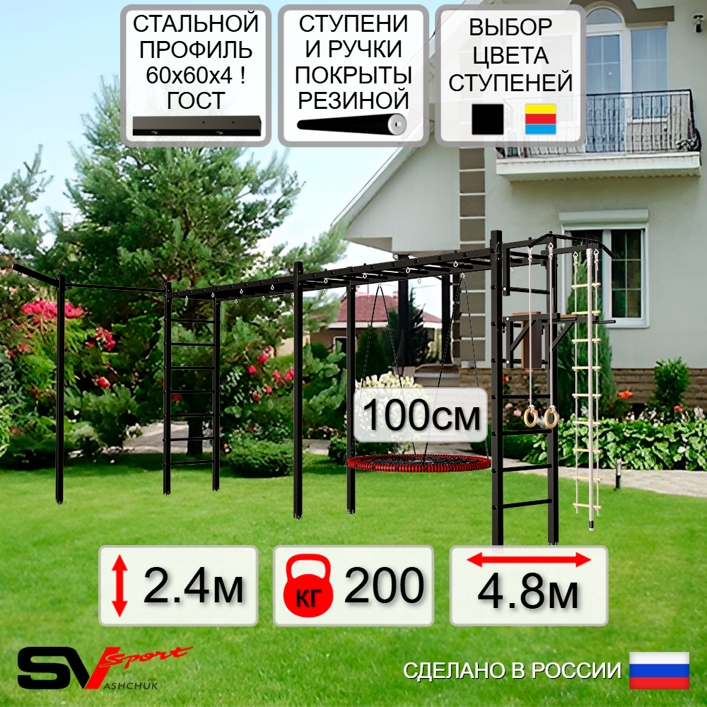 Основные характеристики: Максимально допустимая нагрузка 200 кг; Ширина перекладины 100 см; Вылет турника от комплекса 48 см; Ширина креплений турника 55 см; Полимерная покраска; Резиновые ручки длина 16 см; Цвет покраски: черный; Цвет фурнитуры: черный; Гарантия 24 месяца.