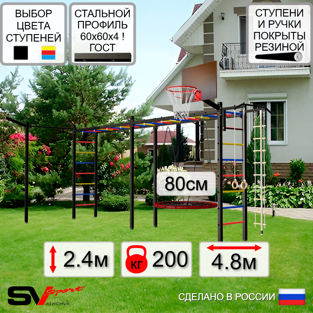 КОМПЛЕКТАЦИЯ: Каркас УШС Sv Sport Рукоход х 2, Турник Sv Sport стандарт к УШС, Качели - гнездо 80см, Щит баскетбольный Sv Sport c кронштейном к УШС Sv Sport, Кронштейн для подвеса боксерского мешка, Комплект: канат с крепежом, кольца гимнастические деревянные, лестница веревочная, Комплект турник прямой.