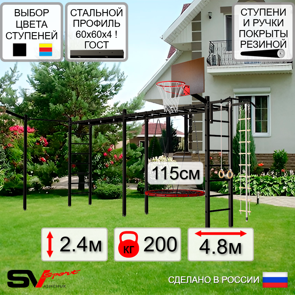 КОМПЛЕКТАЦИЯ: Каркас УШС Sv Sport Рукоход х 2, Турник Sv Sport стандарт к УШС, Качели - гнездо 115см, Щит баскетбольный Sv Sport c кронштейном к УШС Sv Sport, Кронштейн для подвеса боксерского мешка, Комплект: канат с крепежом, кольца гимнастические деревянные, лестница веревочная, Комплект турник прямой.