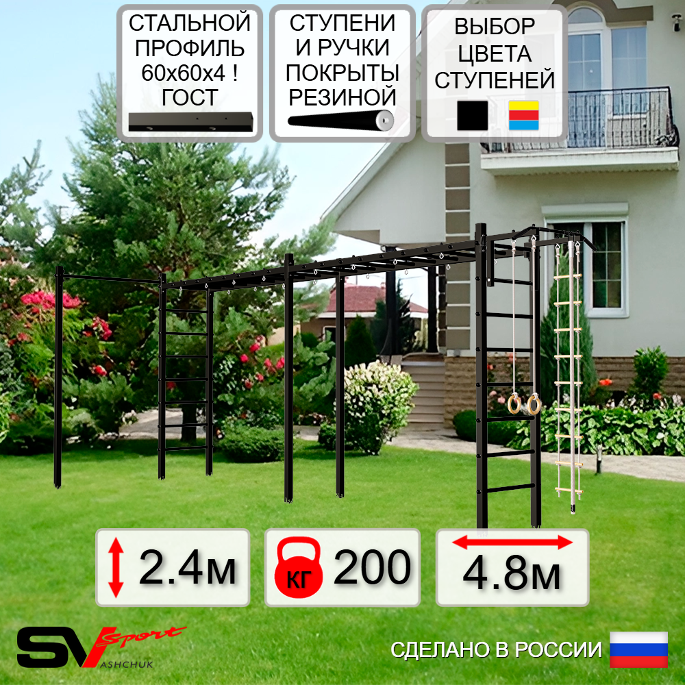КОМПЛЕКТАЦИЯ: Каркас УШС Sv Sport Рукоход х 2, Турник Sv Sport стандарт к УШС, Комплект: канат с крепежом, кольца гимнастические деревянные, лестница веревочная, Комплект турник прямой.
