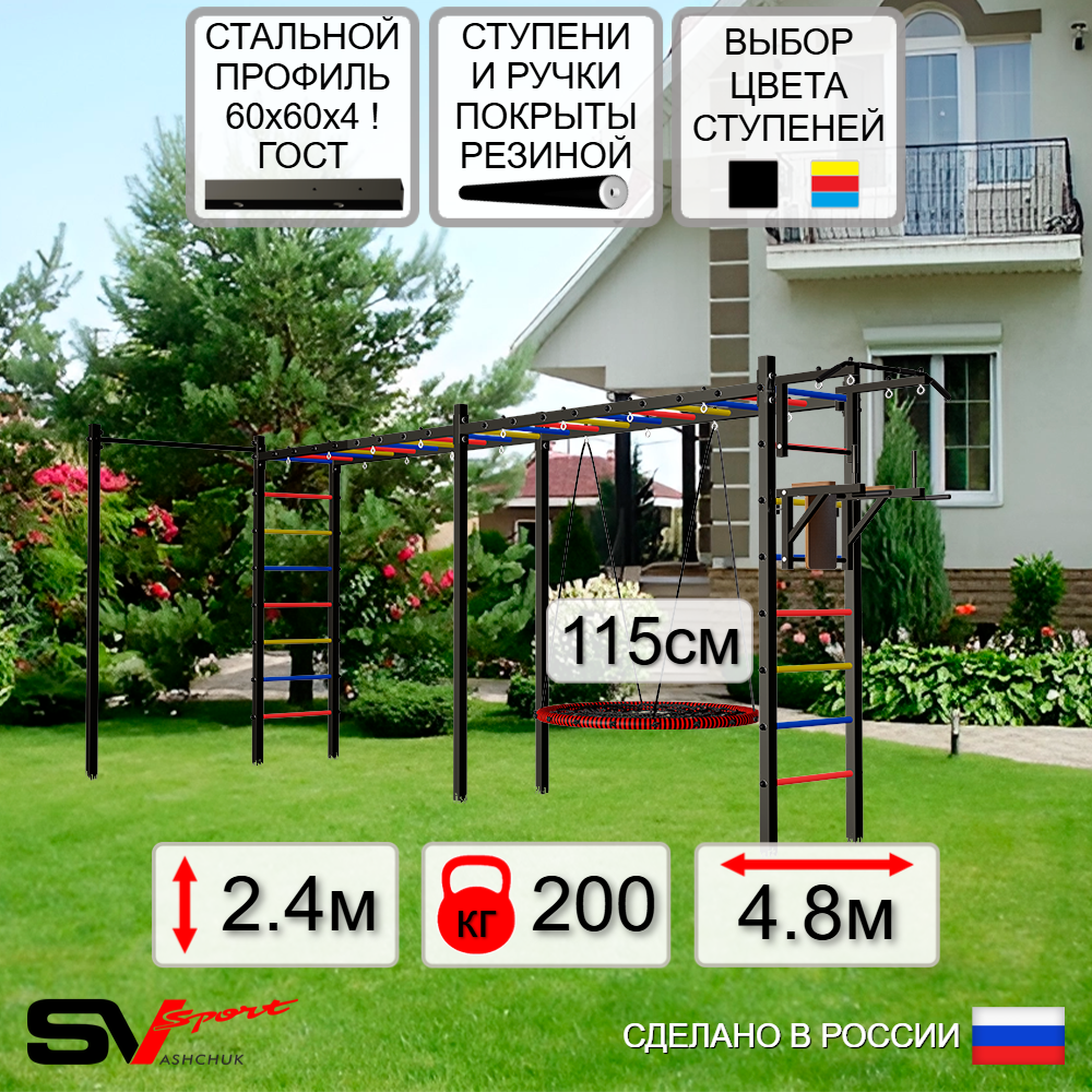 КОМПЛЕКТАЦИЯ: Каркас УШС Sv Sport Рукоход х 2, Турник Sv Sport стандарт к УШС, Брусья Sv Sport к УШС, Качели - гнездо 115см, Комплект турник прямой.