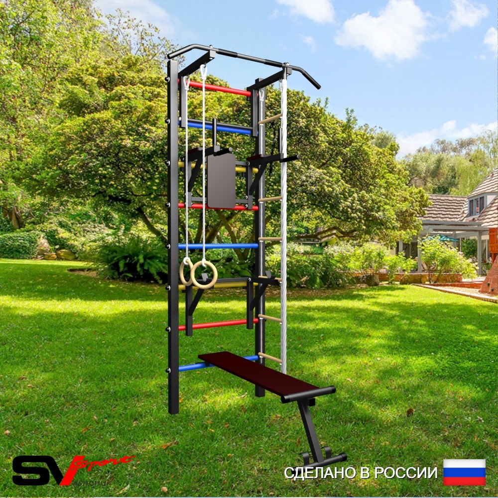 КОМПЛЕКТАЦИЯ: Уличная шведская стенка Sv Sport, Турник Sv Sport стандарт к УШС, Брусья Sv Sport к УШС, Стойка под штангу Sv Sport к УШС, Скамья для пресса и жима Sv Sport к УШС, Комплект: канат с крепежом, кольца гимнастические деревянные, лестница веревочная.