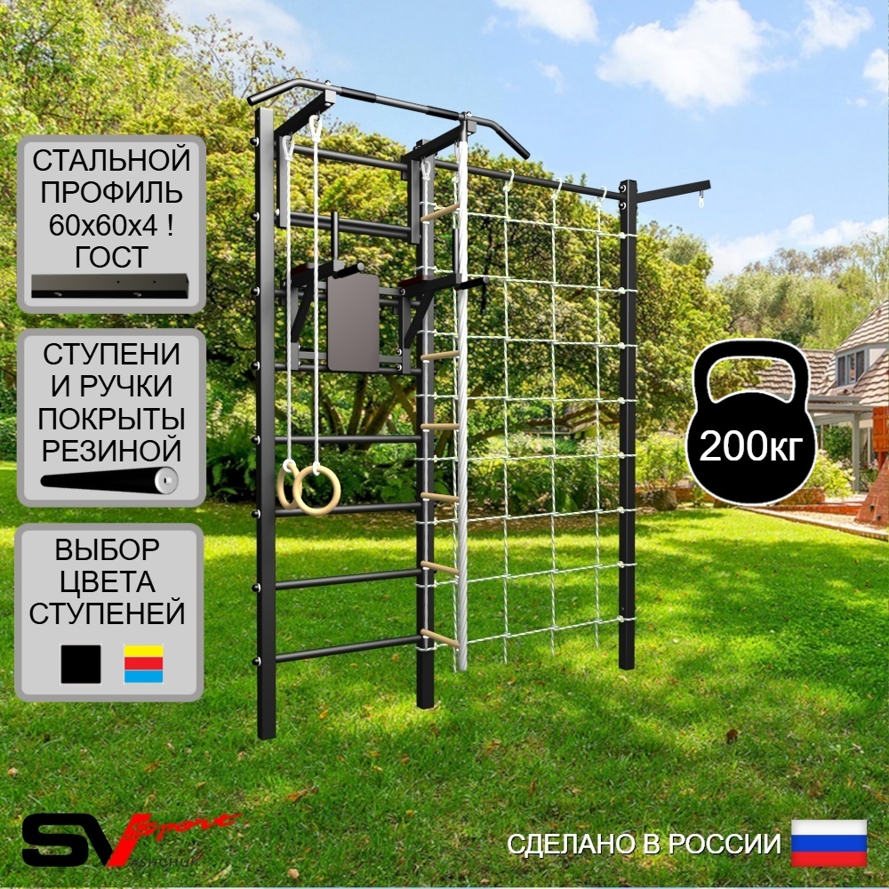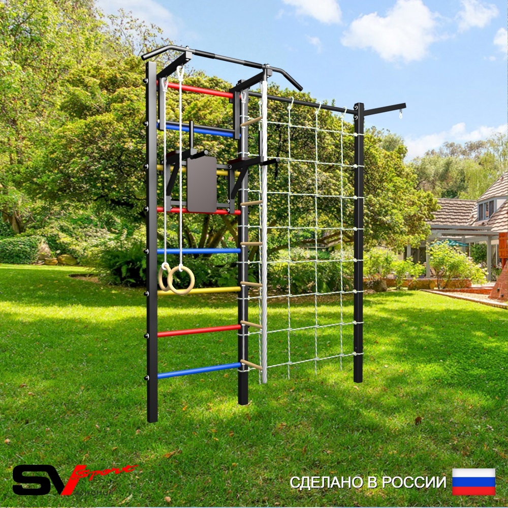 КОМПЛЕКТАЦИЯ: Уличная шведская стенка Sv Sport, Турник Sv Sport стандарт к УШС, Брусья Sv Sport к УШС, Комплект: канат с крепежом, кольца гимнастические деревянные, лестница веревочная, Кронштейн для подвеса боксерского мешка, Сетка к спортивному комплексу, Комплект турник прямой.