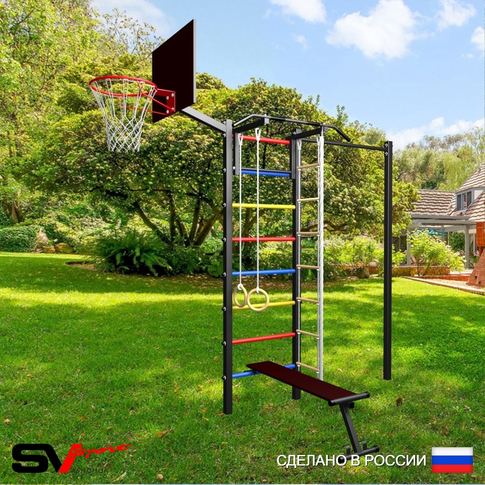 КОМПЛЕКТАЦИЯ: Уличная шведская стенка Sv Sport, Турник Sv Sport стандарт к УШС, Скамья для пресса и жима Sv Sport к УШС, Комплект: канат с крепежом, кольца гимнастические деревянные, лестница веревочная, Щит баскетбольный Sv Sport c кронштейном к УШС Sv Sport, Комплект турник прямой.