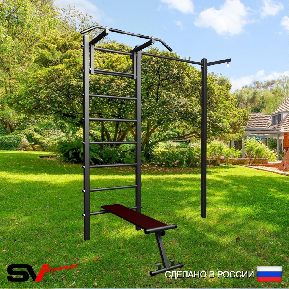 КОМПЛЕКТАЦИЯ: Уличная шведская стенка Sv Sport, Турник Sv Sport стандарт к УШС, Скамья для пресса и жима Sv Sport к УШС, Кронштейн для подвеса боксерского мешка, Комплект турник прямой.
