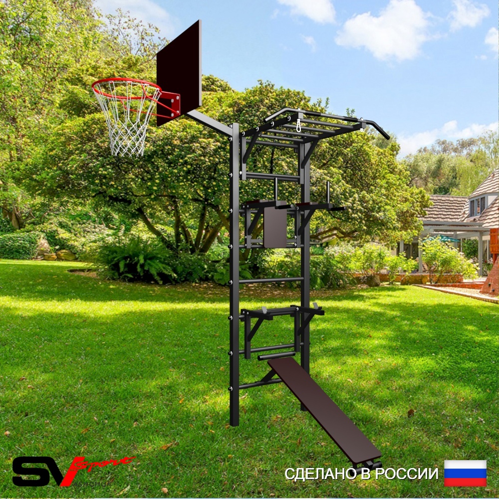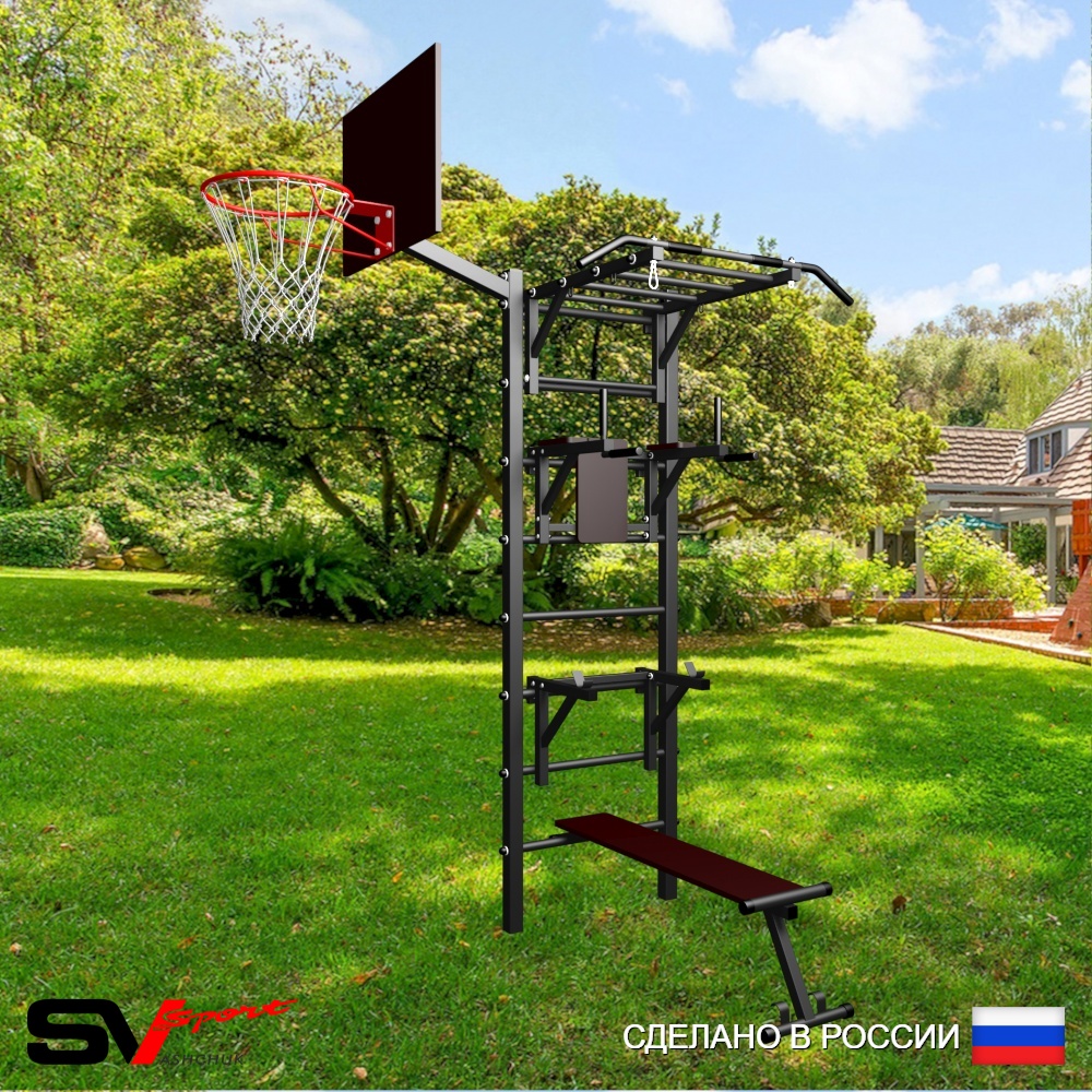 КОМПЛЕКТАЦИЯ: Уличная шведская стенка Sv Sport, Турник Sv Sport Рукоход к УШС, Брусья Sv Sport к УШС, Стойка под штангу Sv Sport к УШС, Скамья для пресса и жима Sv Sport к УШС, Щит баскетбольный Sv Sport c кронштейном к УШС Sv Sport.