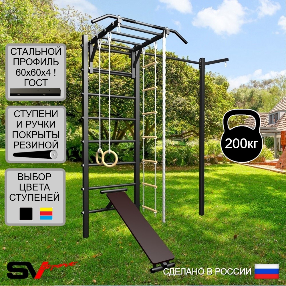 КОМПЛЕКТАЦИЯ: Уличная шведская стенка Sv Sport, Турник Sv Sport Рукоход к УШС, Скамья для пресса и жима Sv Sport к УШС, Комплект: канат с крепежом, кольца гимнастические деревянные, лестница веревочная, Кронштейн для подвеса боксерского мешка, Комплект турник прямой.