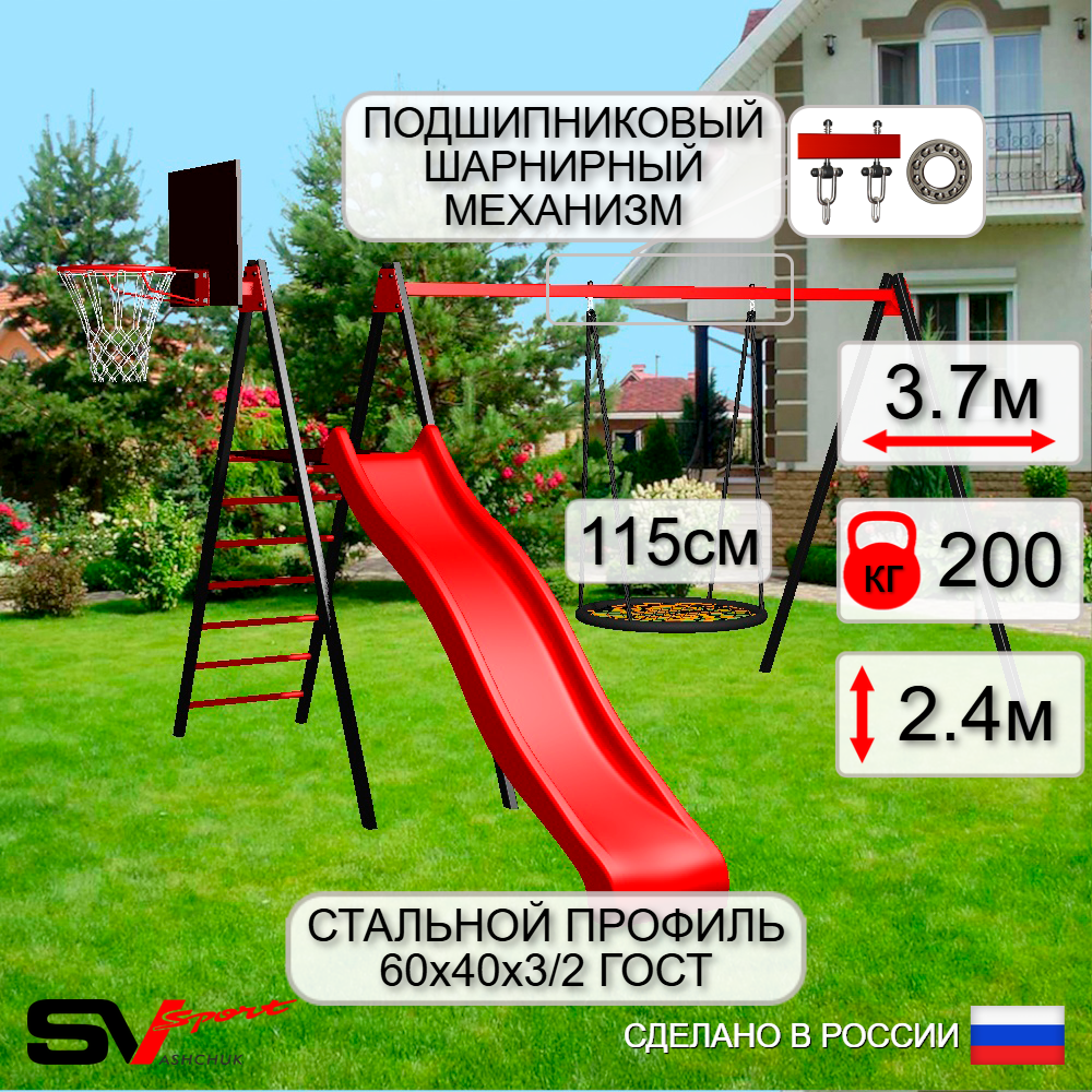 КОМПЛЕКТАЦИЯ: Каркас УК Sv Sport 3.7м, Щит баскетбольный Sv Sport c кронштейном к УК Sv Sport, Качели - гнездо 115см, Комплект горка Sv Sport к уличным качелям, Подвесы для качелей на подшипниках Sv Sport 1 компл.