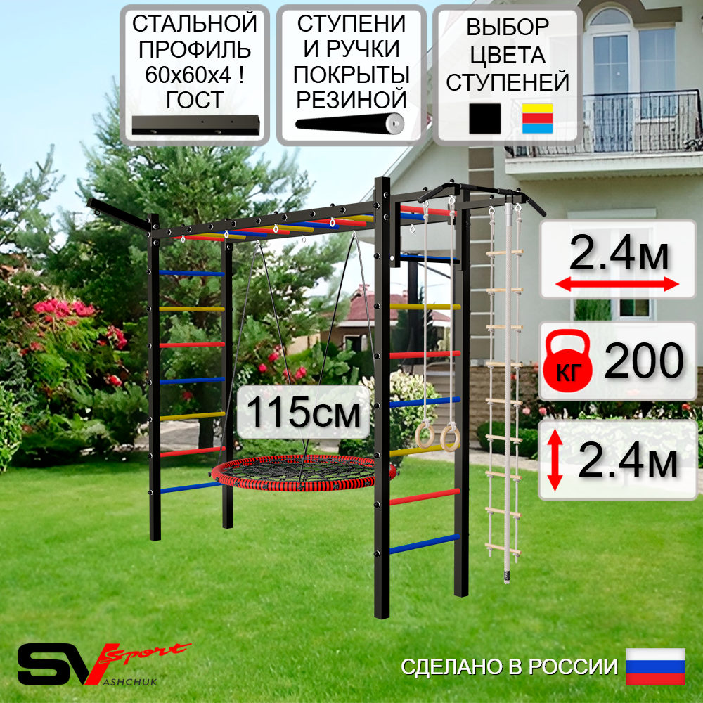 КОМПЛЕКТАЦИЯ: Каркас УШС Sv Sport Рукоход, Турник Sv Sport стандарт к УШС, Качели - гнездо 115см, Кронштейн для подвеса боксерского мешка, Комплект: канат с крепежом, кольца гимнастические деревянные, лестница веревочная.