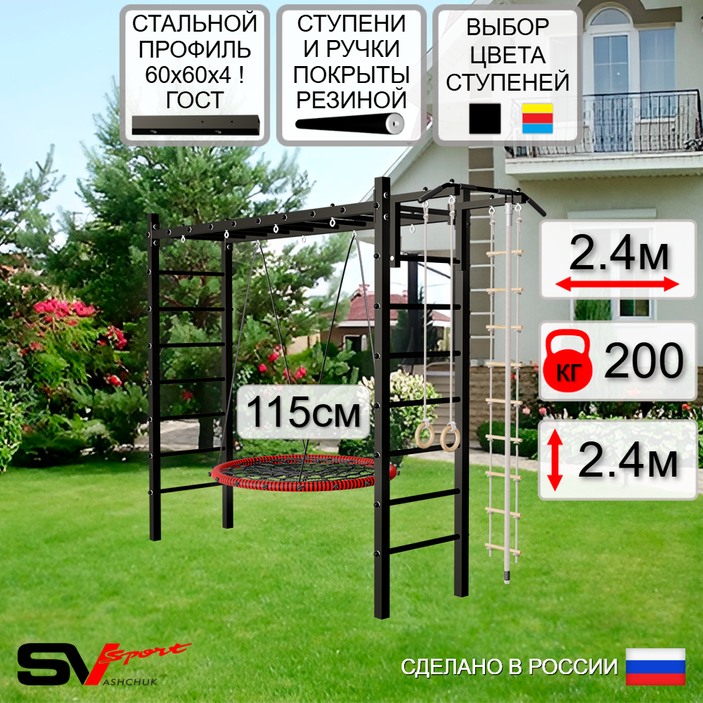 КОМПЛЕКТАЦИЯ: Каркас УШС Sv Sport Рукоход, Турник Sv Sport стандарт к УШС, Качели - гнездо 115см, Комплект: канат с крепежом, кольца гимнастические деревянные, лестница веревочная.