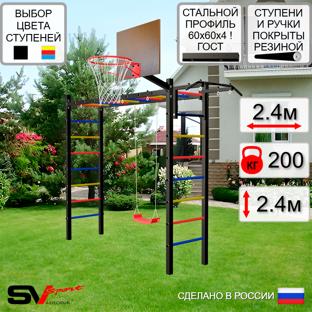 КОМПЛЕКТАЦИЯ: Каркас УШС Sv Sport Рукоход, Турник Sv Sport стандарт к УШС, Качели пластиковые "Лодочка", Щит баскетбольный Sv Sport c кронштейном к УШС Sv Sport.