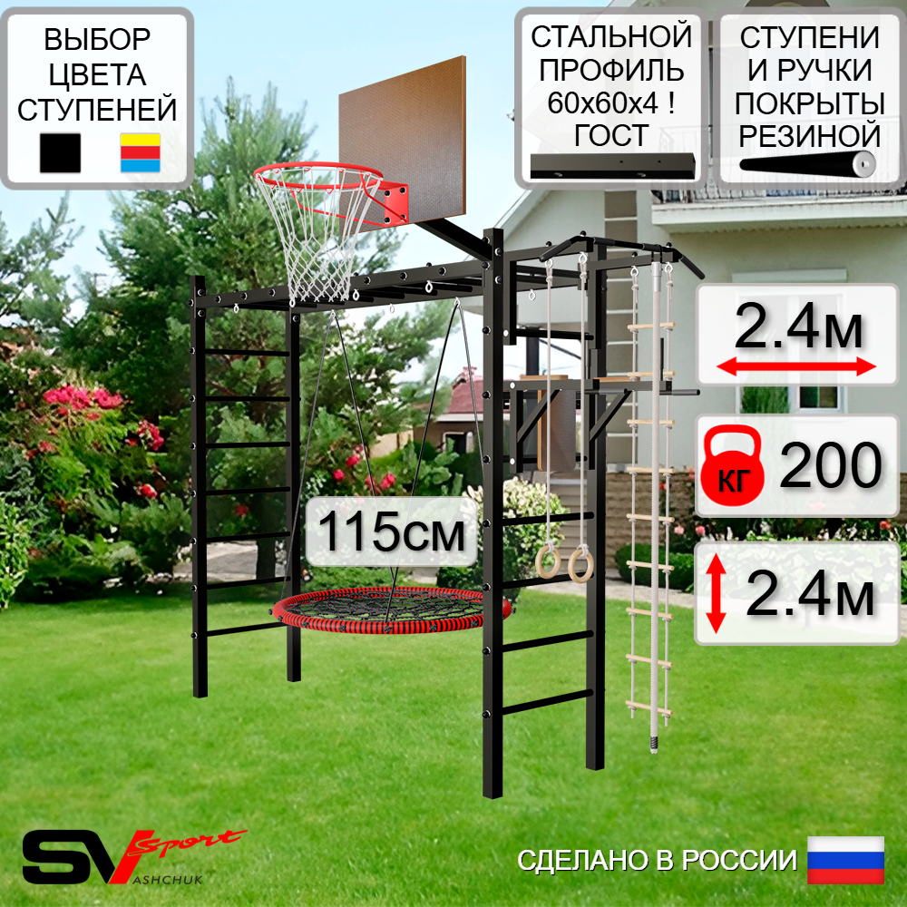 КОМПЛЕКТАЦИЯ: Каркас УШС Sv Sport Рукоход, Турник Sv Sport стандарт к УШС, Брусья Sv Sport к УШС, Качели - гнездо 115см, Щит баскетбольный Sv Sport c кронштейном к УШС Sv Sport, Комплект: канат с крепежом, кольца гимнастические деревянные, лестница веревочная.