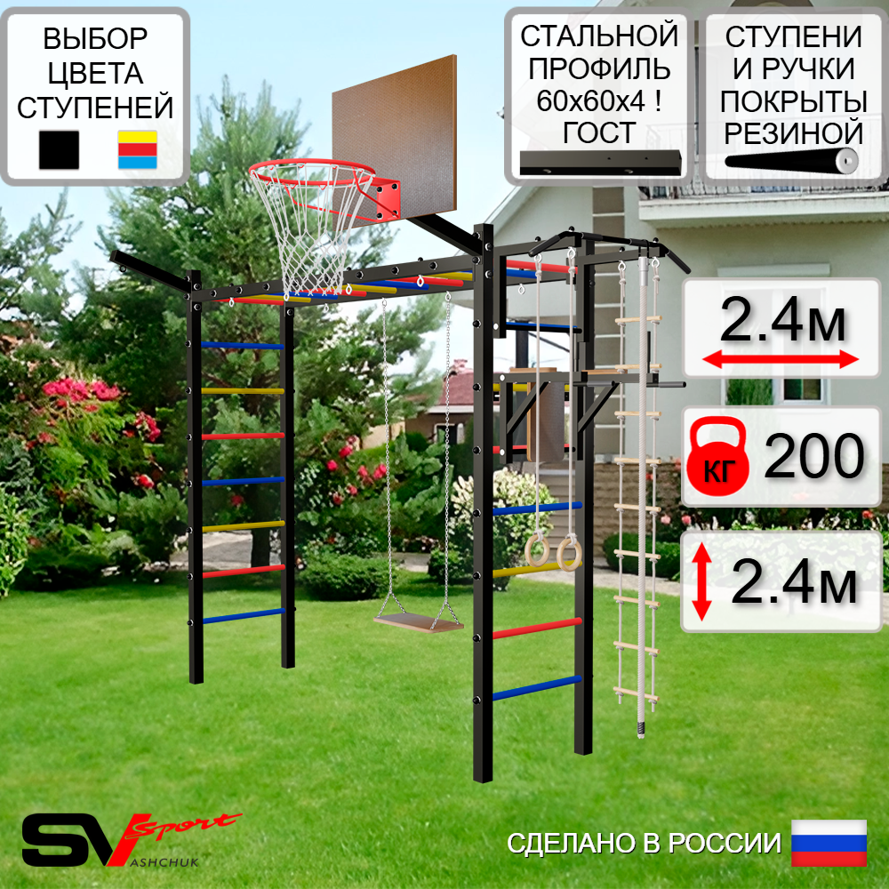 КОМПЛЕКТАЦИЯ: Каркас УШС Sv Sport Рукоход, Турник Sv Sport стандарт к УШС, Брусья Sv Sport к УШС, Качели деревянные на цепях Sv Sport, Щит баскетбольный Sv Sport c кронштейном к УШС Sv Sport, Кронштейн для подвеса боксерского мешка, Комплект: канат с крепежом, кольца гимнастические деревянные, лестница веревочная.