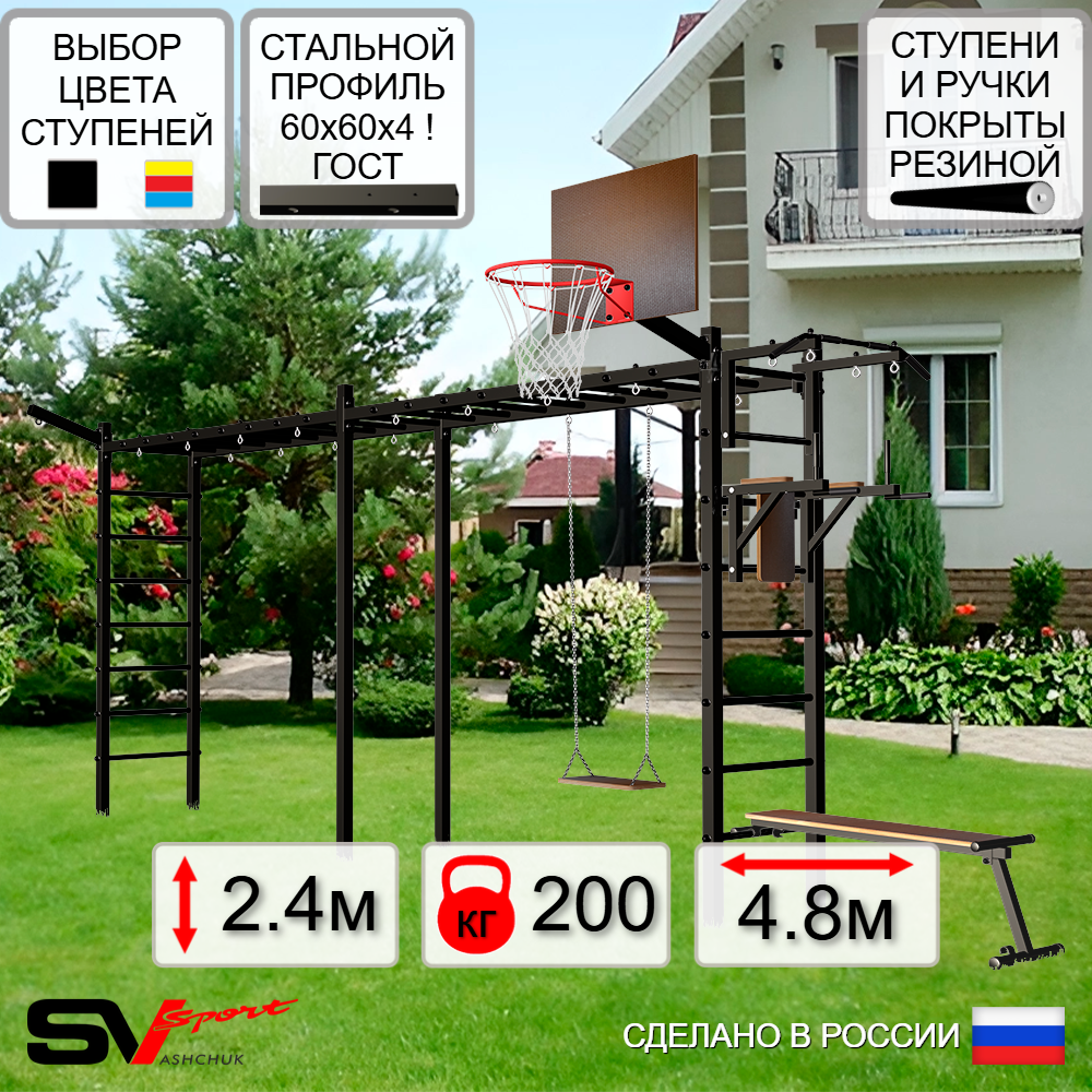 КОМПЛЕКТАЦИЯ: Каркас УШС Sv Sport Рукоход х 2, Турник Sv Sport стандарт к УШС, Брусья Sv Sport к УШС, Скамья для пресса и жима Sv Sport к УШС, Качели деревянные на цепях Sv Sport, Щит баскетбольный Sv Sport c кронштейном к УШС Sv Sport, Кронштейн для подвеса боксерского мешка.
