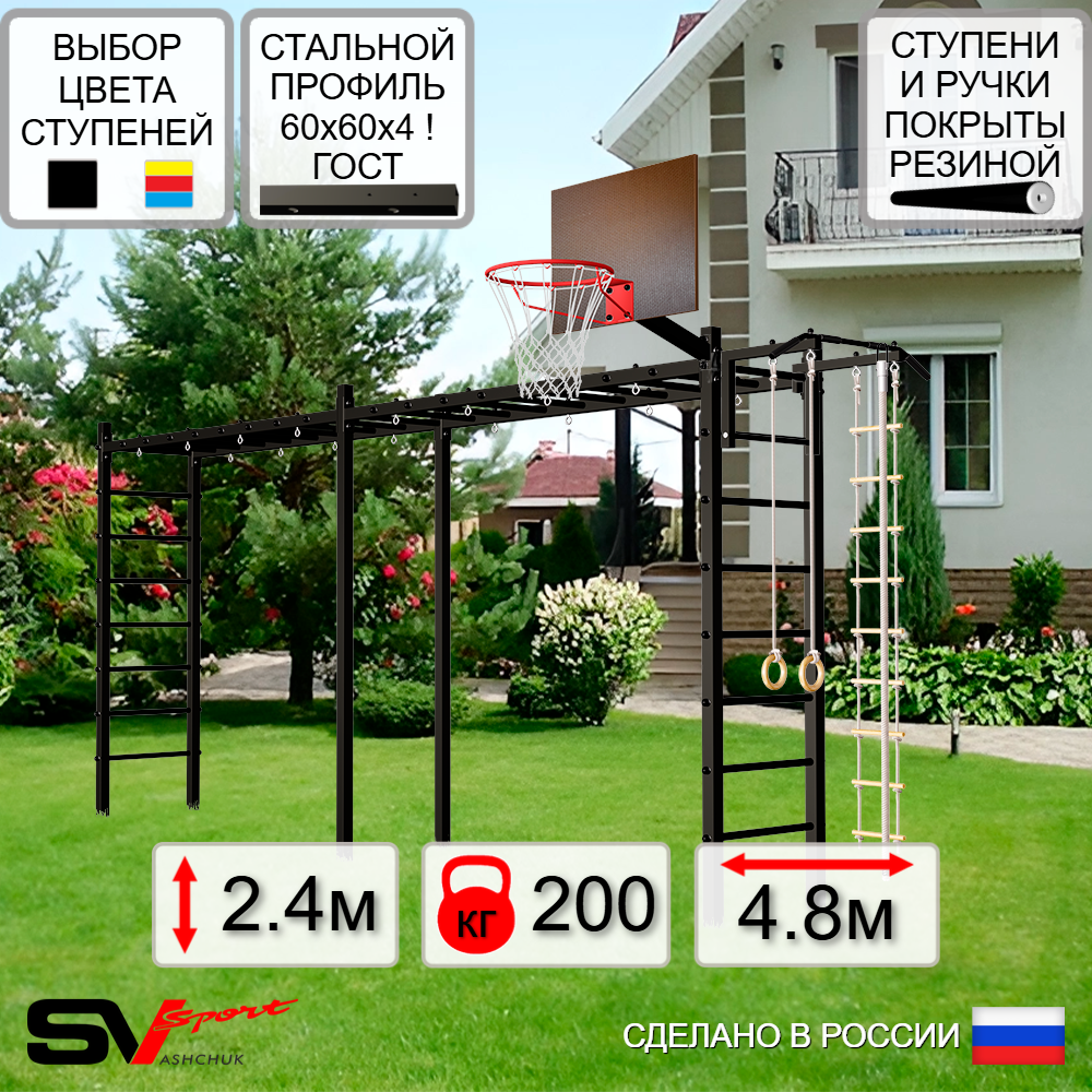 КОМПЛЕКТАЦИЯ: Каркас УШС Sv Sport Рукоход х 2, Турник Sv Sport стандарт к УШС, Щит баскетбольный Sv Sport c кронштейном к УШС Sv Sport, Комплект: канат с крепежом, кольца гимнастические деревянные, лестница веревочная.