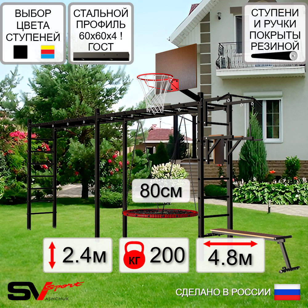 КОМПЛЕКТАЦИЯ: Каркас УШС Sv Sport Рукоход х 2, Турник Sv Sport стандарт к УШС, Брусья Sv Sport к УШС, Скамья для пресса и жима Sv Sport к УШС, Качели - гнездо 80см, Щит баскетбольный Sv Sport c кронштейном к УШС Sv Sport.
