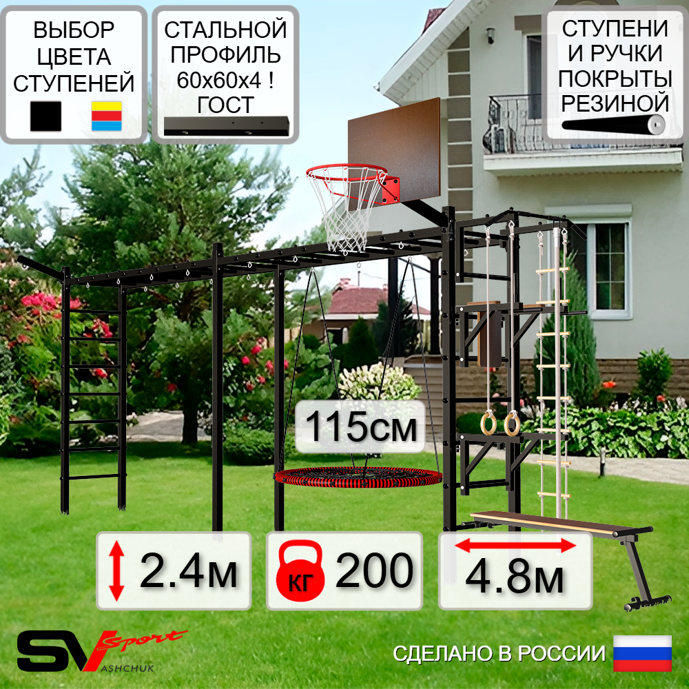 КОМПЛЕКТАЦИЯ: Каркас УШС Sv Sport Рукоход х 2, Турник Sv Sport стандарт к УШС, Брусья Sv Sport к УШС, Стойка под штангу Sv Sport к УШС, Скамья для пресса и жима Sv Sport к УШС, Качели - гнездо 115см, Щит баскетбольный Sv Sport c кронштейном к УШС Sv Sport, Кронштейн для подвеса боксерского мешка, Комплект: канат с крепежом, кольца гимнастические деревянные, лестница веревочная.