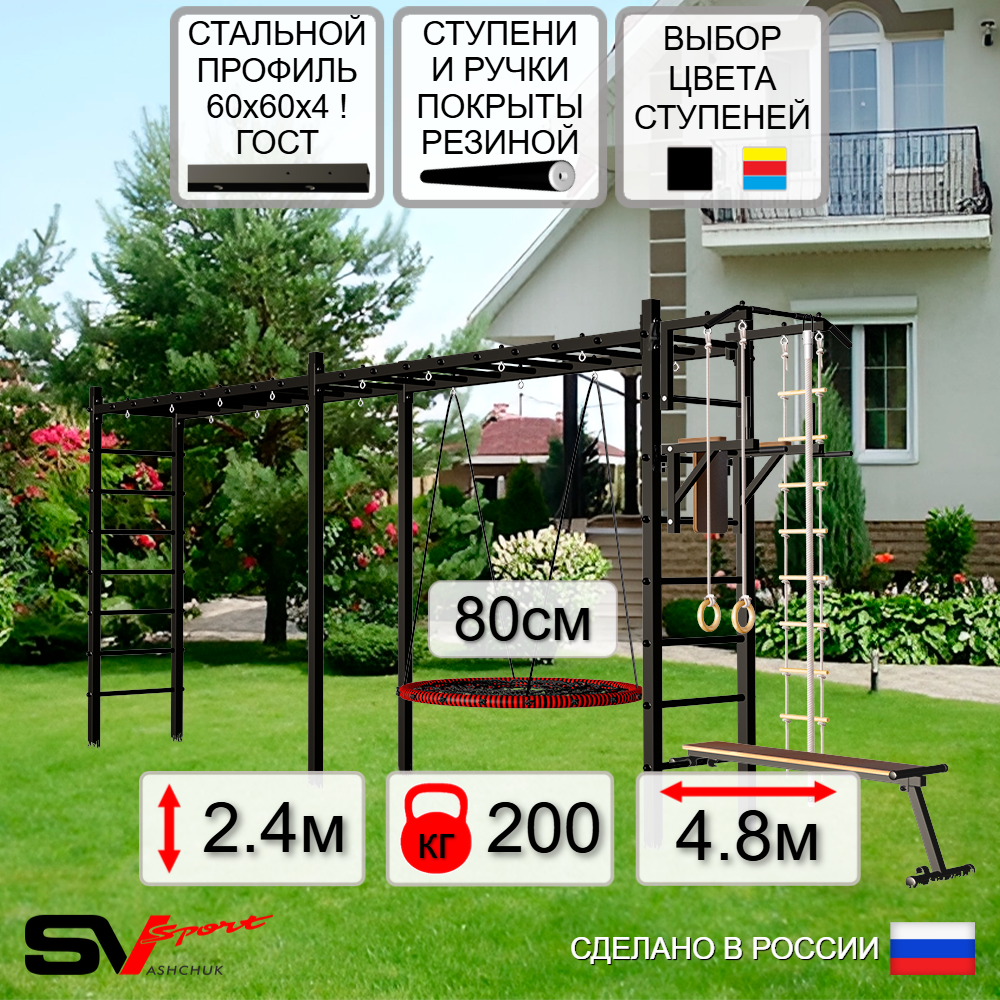 КОМПЛЕКТАЦИЯ: Каркас УШС Sv Sport Рукоход х 2, Турник Sv Sport стандарт к УШС, Брусья Sv Sport к УШС, Скамья для пресса и жима Sv Sport к УШС, Качели - гнездо 80см, Комплект: канат с крепежом, кольца гимнастические деревянные, лестница веревочная.