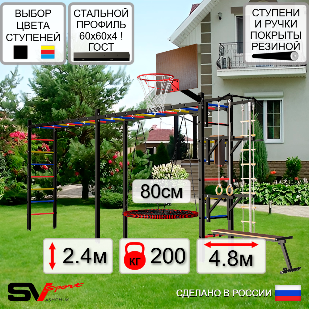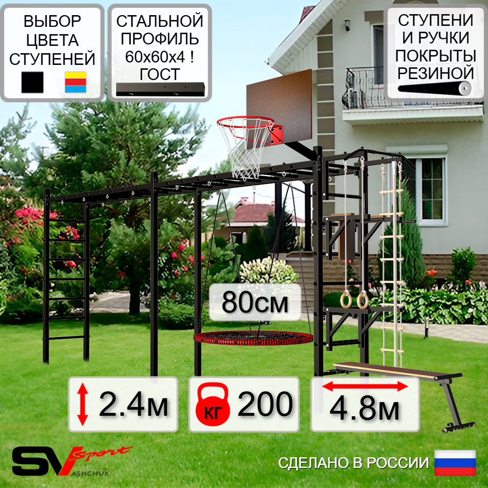 КОМПЛЕКТАЦИЯ: Каркас УШС Sv Sport Рукоход х 2, Турник Sv Sport стандарт к УШС, Брусья Sv Sport к УШС, Стойка под штангу Sv Sport к УШС, Скамья для пресса и жима Sv Sport к УШС, Качели - гнездо 80см, Щит баскетбольный Sv Sport c кронштейном к УШС Sv Sport, Комплект: канат с крепежом, кольца гимнастические деревянные, лестница веревочная.