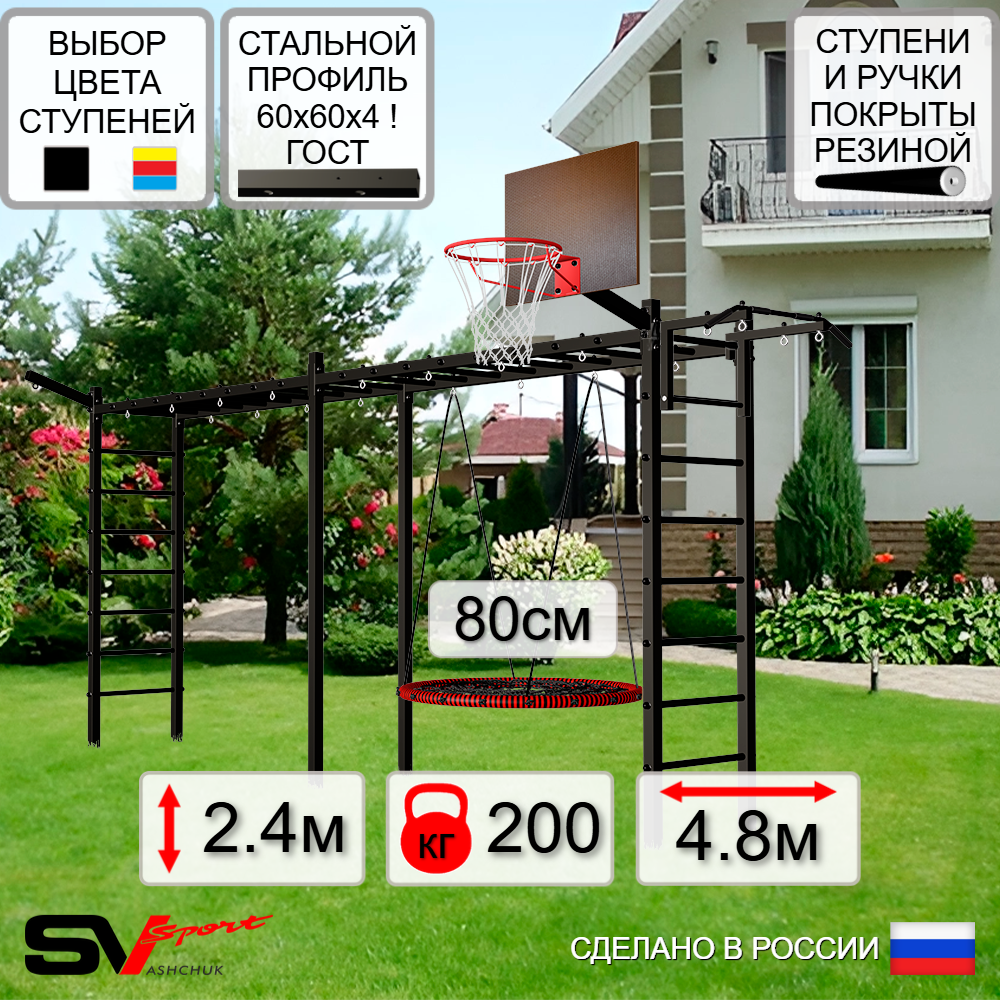 КОМПЛЕКТАЦИЯ: Каркас УШС Sv Sport Рукоход х 2, Турник Sv Sport стандарт к УШС, Качели - гнездо 80см, Щит баскетбольный Sv Sport c кронштейном к УШС Sv Sport, Кронштейн для подвеса боксерского мешка.