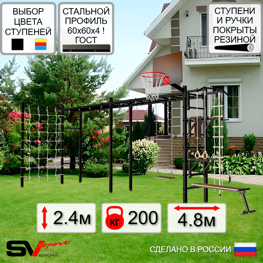 КОМПЛЕКТАЦИЯ: Каркас УШС Sv Sport Рукоход х 2, Турник Sv Sport стандарт к УШС, Брусья Sv Sport к УШС, Стойка под штангу Sv Sport к УШС, Скамья для пресса и жима Sv Sport к УШС, Качели деревянные на цепях Sv Sport, Щит баскетбольный Sv Sport c кронштейном к УШС Sv Sport, Комплект: канат с крепежом, кольца гимнастические деревянные, лестница веревочная, Сетка к спортивному комплексу, Комплект турник прямой.