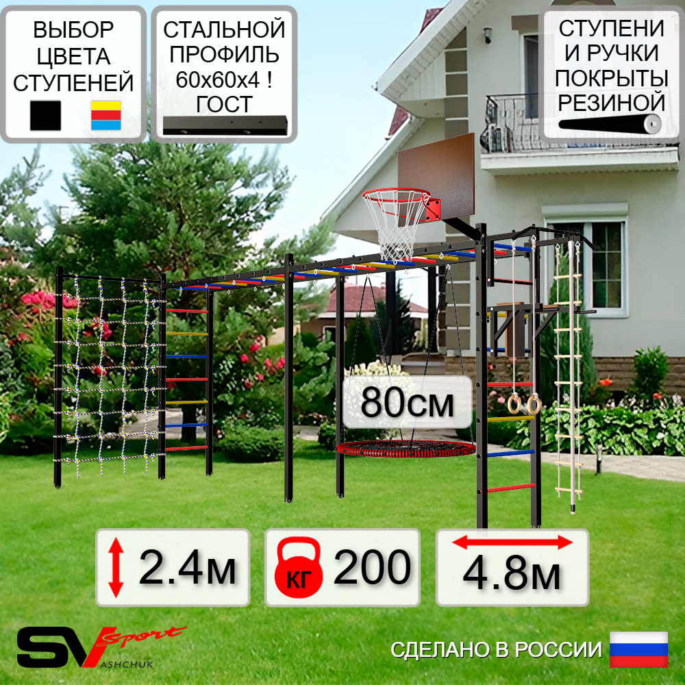 КОМПЛЕКТАЦИЯ: Каркас УШС Sv Sport Рукоход х 2, Турник Sv Sport стандарт к УШС, Брусья Sv Sport к УШС, Качели - гнездо 80см, Щит баскетбольный Sv Sport c кронштейном к УШС Sv Sport, Комплект: канат с крепежом, кольца гимнастические деревянные, лестница веревочная, Сетка к спортивному комплексу, Комплект турник прямой.