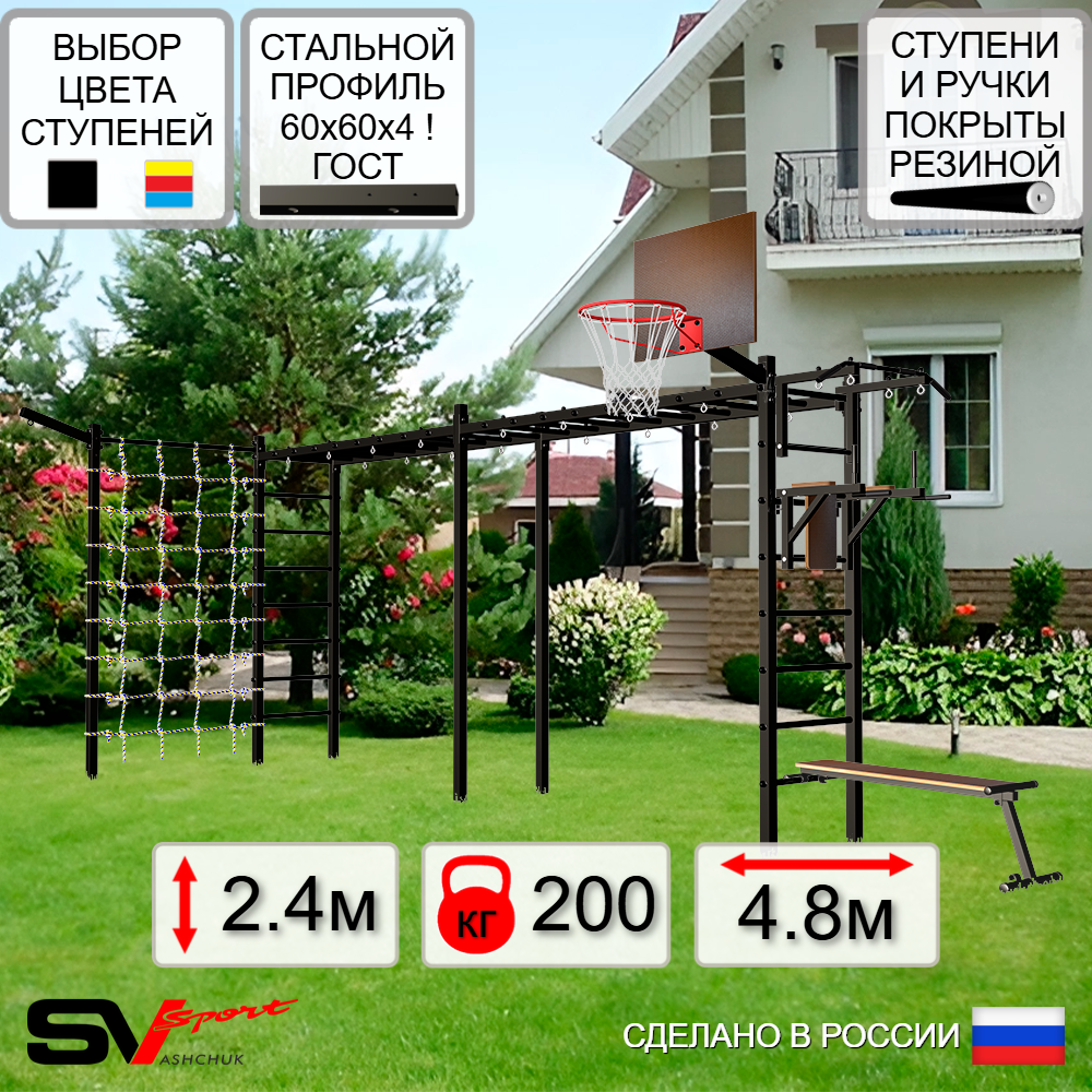 КОМПЛЕКТАЦИЯ: Каркас УШС Sv Sport Рукоход х 2, Турник Sv Sport стандарт к УШС, Брусья Sv Sport к УШС, Скамья для пресса и жима Sv Sport к УШС, Щит баскетбольный Sv Sport c кронштейном к УШС Sv Sport, Кронштейн для подвеса боксерского мешка, Сетка к спортивному комплексу, Комплект турник прямой.