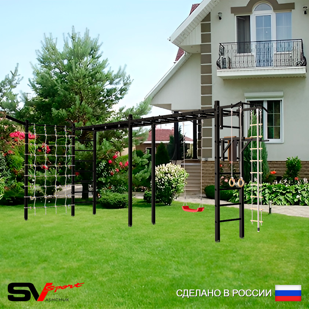 КОМПЛЕКТАЦИЯ: Каркас УШС Sv Sport Рукоход х 2, Турник Sv Sport стандарт к УШС, Брусья Sv Sport к УШС, Качели пластиковые "Лодочка", Кронштейн для подвеса боксерского мешка, Комплект: канат с крепежом, кольца гимнастические деревянные, лестница веревочная, Сетка к спортивному комплексу, Комплект турник прямой.