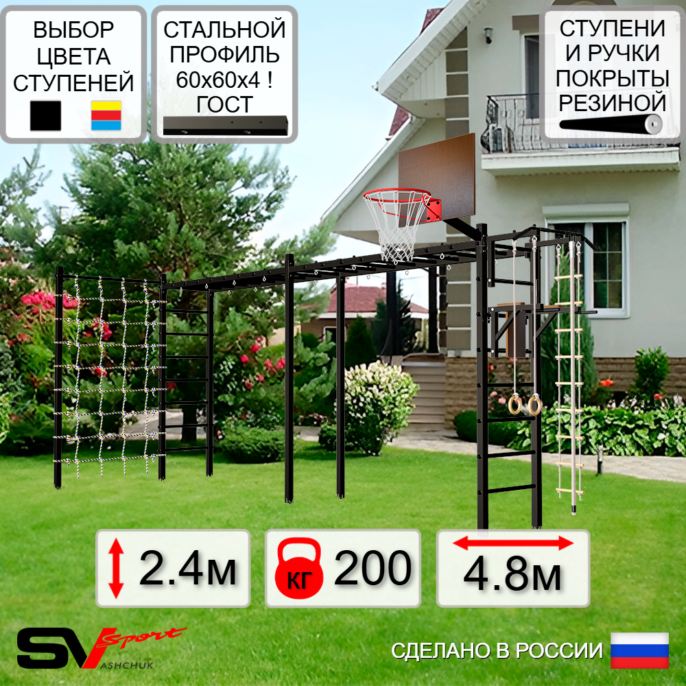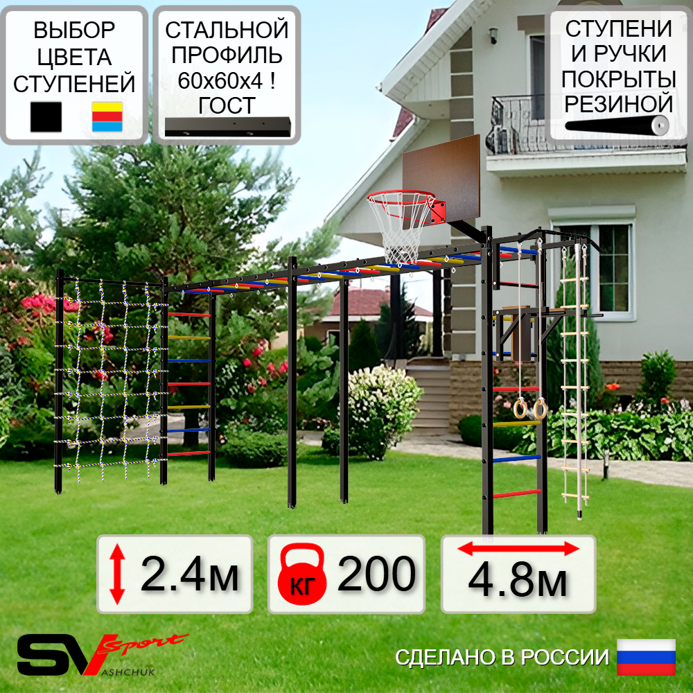 КОМПЛЕКТАЦИЯ: Каркас УШС Sv Sport Рукоход х 2, Турник Sv Sport стандарт к УШС, Брусья Sv Sport к УШС, Щит баскетбольный Sv Sport c кронштейном к УШС Sv Sport, Комплект: канат с крепежом, кольца гимнастические деревянные, лестница веревочная, Сетка к спортивному комплексу, Комплект турник прямой.