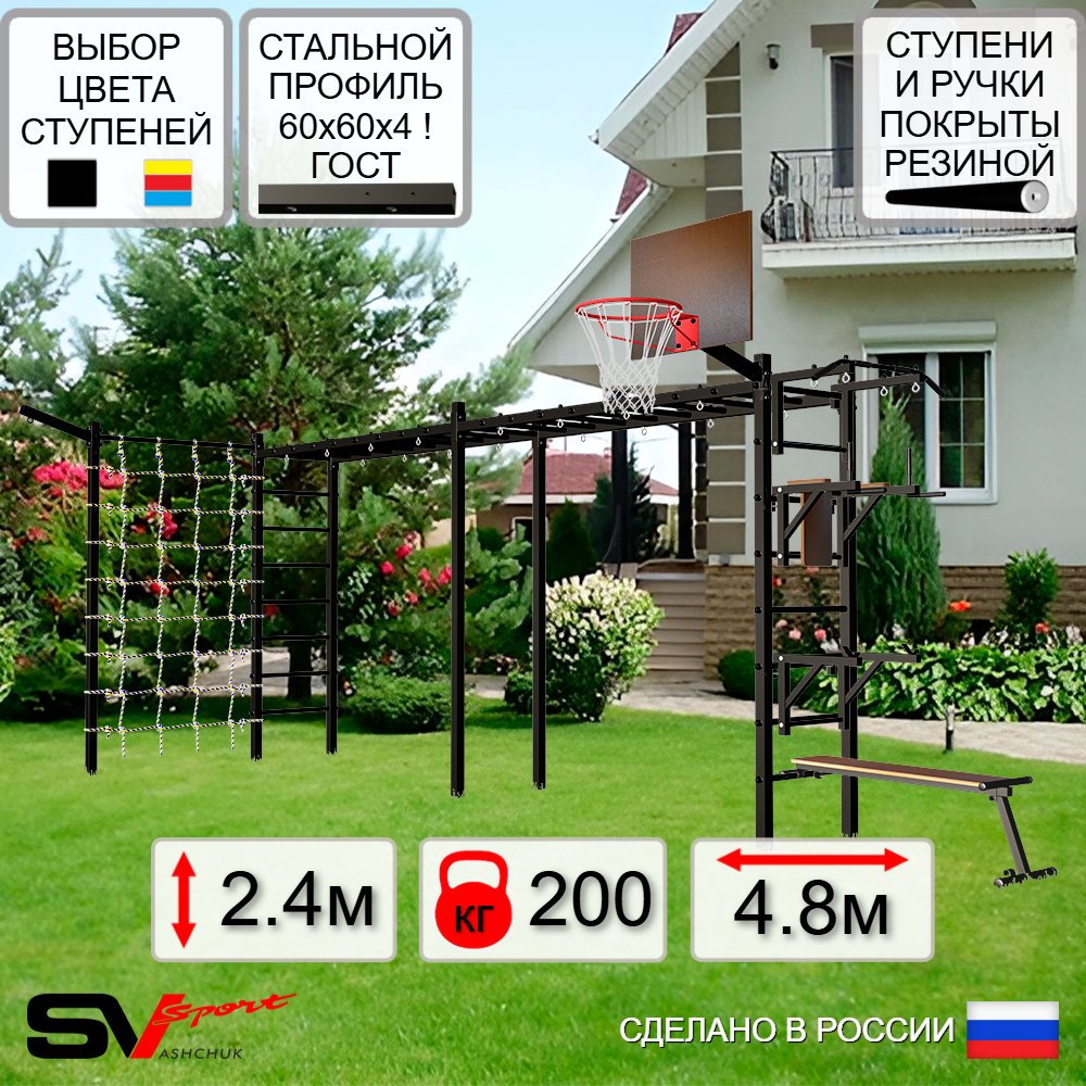 КОМПЛЕКТАЦИЯ: Каркас УШС Sv Sport Рукоход х 2, Турник Sv Sport стандарт к УШС, Брусья Sv Sport к УШС, Стойка под штангу Sv Sport к УШС, Скамья для пресса и жима Sv Sport к УШС, Щит баскетбольный Sv Sport c кронштейном к УШС Sv Sport, Кронштейн для подвеса боксерского мешка, Сетка к спортивному комплексу, Комплект турник прямой.