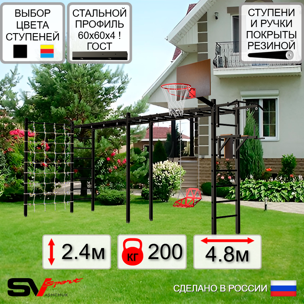 КОМПЛЕКТАЦИЯ: Каркас УШС Sv Sport Рукоход х 2, Турник Sv Sport стандарт к УШС, Брусья Sv Sport к УШС, Качели пластиковые со спинкой на цепях, Щит баскетбольный Sv Sport c кронштейном к УШС Sv Sport, Сетка к спортивному комплексу, Комплект турник прямой.