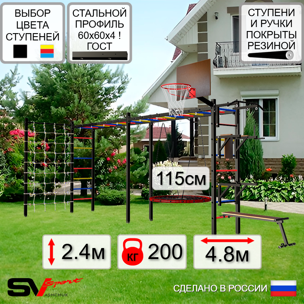 КОМПЛЕКТАЦИЯ: Каркас УШС Sv Sport Рукоход х 2, Турник Sv Sport стандарт к УШС, Брусья Sv Sport к УШС, Стойка под штангу Sv Sport к УШС, Скамья для пресса и жима Sv Sport к УШС, Качели - гнездо 115см, Щит баскетбольный Sv Sport c кронштейном к УШС Sv Sport, Сетка к спортивному комплексу, Комплект турник прямой.