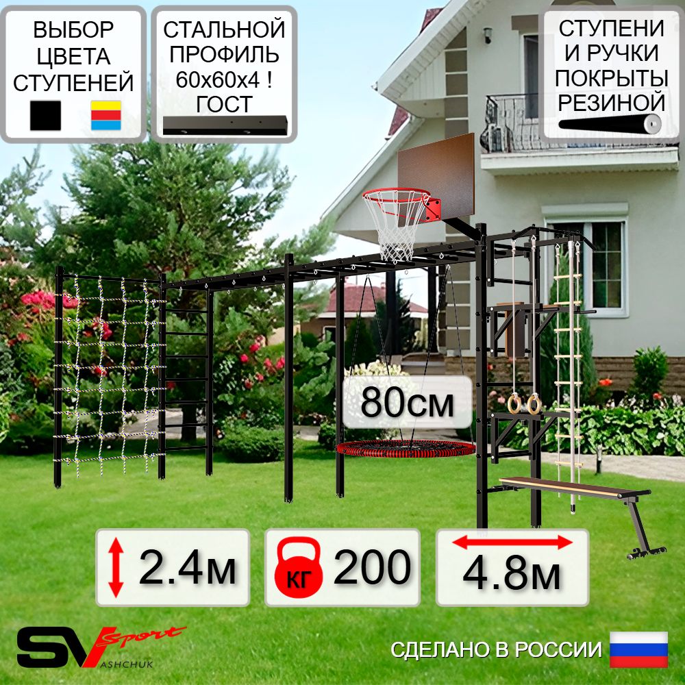 КОМПЛЕКТАЦИЯ: Каркас УШС Sv Sport Рукоход х 2, Турник Sv Sport стандарт к УШС, Брусья Sv Sport к УШС, Стойка под штангу Sv Sport к УШС, Скамья для пресса и жима Sv Sport к УШС, Качели - гнездо 80см, Щит баскетбольный Sv Sport c кронштейном к УШС Sv Sport, Комплект: канат с крепежом, кольца гимнастические деревянные, лестница веревочная, Сетка к спортивному комплексу, Комплект турник прямой.