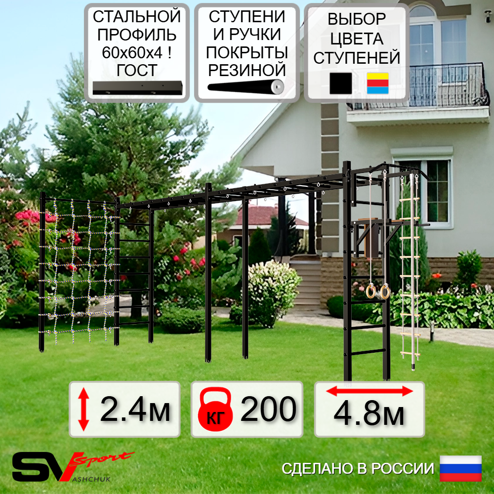КОМПЛЕКТАЦИЯ: Каркас УШС Sv Sport Рукоход х 2, Турник Sv Sport стандарт к УШС, Брусья Sv Sport к УШС, Комплект: канат с крепежом, кольца гимнастические деревянные, лестница веревочная, Сетка к спортивному комплексу, Комплект турник прямой.