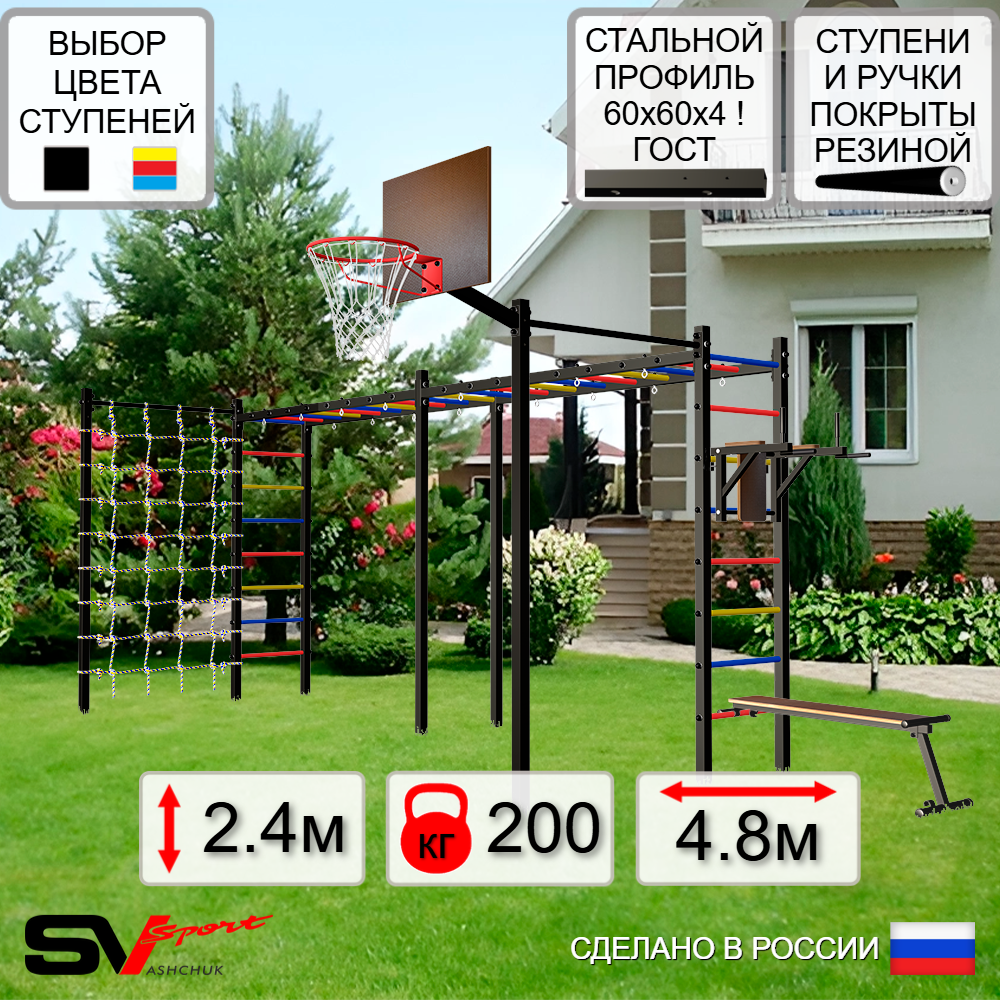 КОМПЛЕКТАЦИЯ: Каркас УШС Sv Sport Рукоход х 2, Брусья Sv Sport к УШС, Скамья для пресса и жима Sv Sport к УШС, Щит баскетбольный Sv Sport c кронштейном к УШС Sv Sport, Сетка к спортивному комплексу, Комплект турник прямой 2шт.