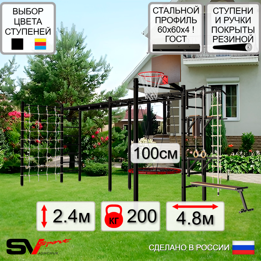 КОМПЛЕКТАЦИЯ: Каркас УШС Sv Sport Рукоход х 2, Турник Sv Sport стандарт к УШС, Брусья Sv Sport к УШС, Стойка под штангу Sv Sport к УШС, Скамья для пресса и жима Sv Sport к УШС, Качели - гнездо 100см, Щит баскетбольный Sv Sport c кронштейном к УШС Sv Sport, Комплект: канат с крепежом, кольца гимнастические деревянные, лестница веревочная, Сетка к спортивному комплексу, Комплект турник прямой 2шт.