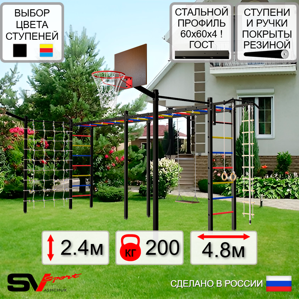 КОМПЛЕКТАЦИЯ: Каркас УШС Sv Sport Рукоход х 2, Турник Sv Sport стандарт к УШС, Качели деревянные на цепях Sv Sport, Щит баскетбольный Sv Sport c кронштейном к УШС Sv Sport, Кронштейн для подвеса боксерского мешка, Комплект: канат с крепежом, кольца гимнастические деревянные, лестница веревочная, Сетка к спортивному комплексу, Комплект турник прямой 2шт.