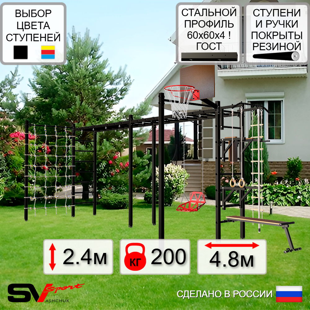 КОМПЛЕКТАЦИЯ: Каркас УШС Sv Sport Рукоход х 2, Турник Sv Sport стандарт к УШС, Брусья Sv Sport к УШС, Стойка под штангу Sv Sport к УШС, Скамья для пресса и жима Sv Sport к УШС, Качели пластиковые со спинкой на цепях, Щит баскетбольный Sv Sport c кронштейном к УШС Sv Sport, Комплект: канат с крепежом, кольца гимнастические деревянные, лестница веревочная, Сетка к спортивному комплексу, Комплект турник прямой 2шт.