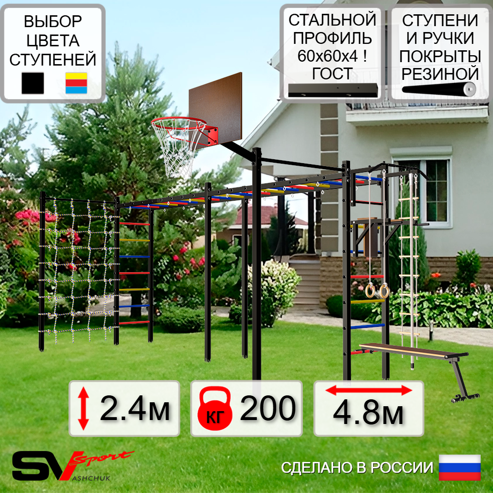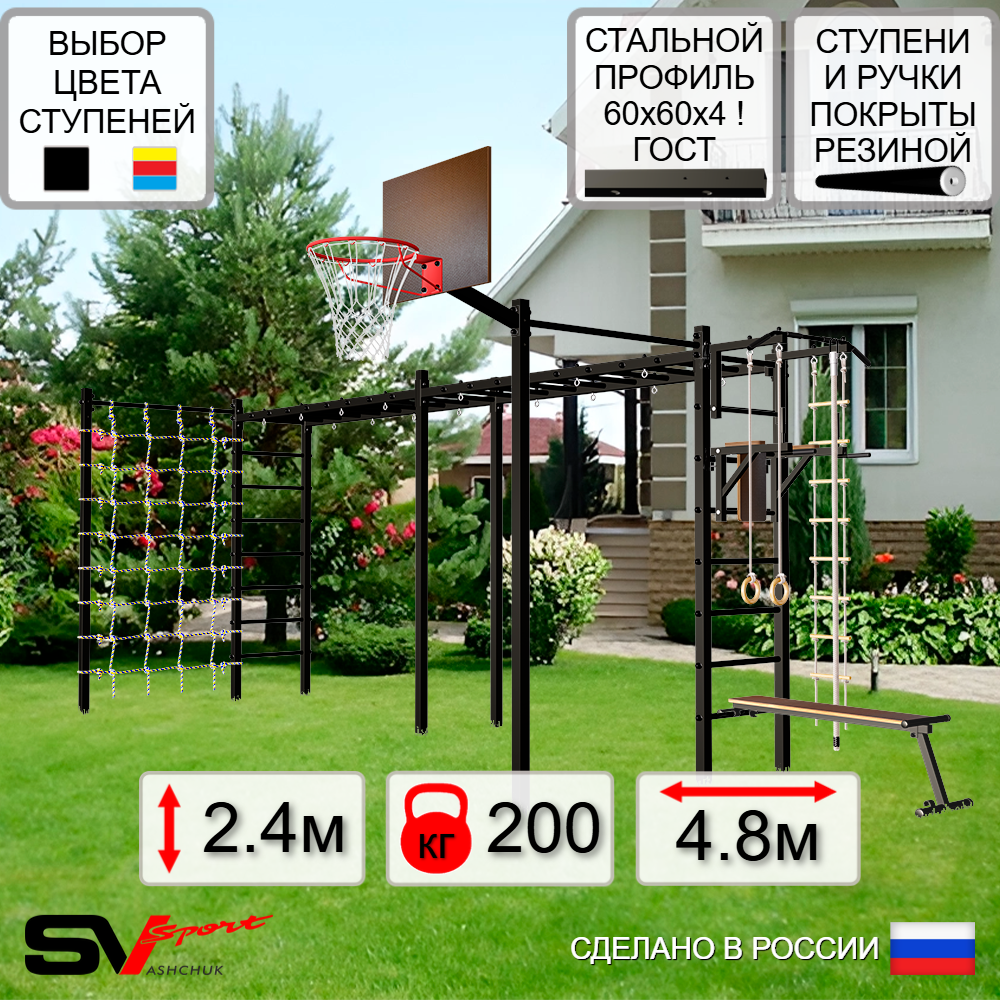 КОМПЛЕКТАЦИЯ: Каркас УШС Sv Sport Рукоход х 2, Турник Sv Sport стандарт к УШС, Брусья Sv Sport к УШС, Скамья для пресса и жима Sv Sport к УШС, Щит баскетбольный Sv Sport c кронштейном к УШС Sv Sport, Комплект: канат с крепежом, кольца гимнастические деревянные, лестница веревочная, Сетка к спортивному комплексу, Комплект турник прямой 2шт.